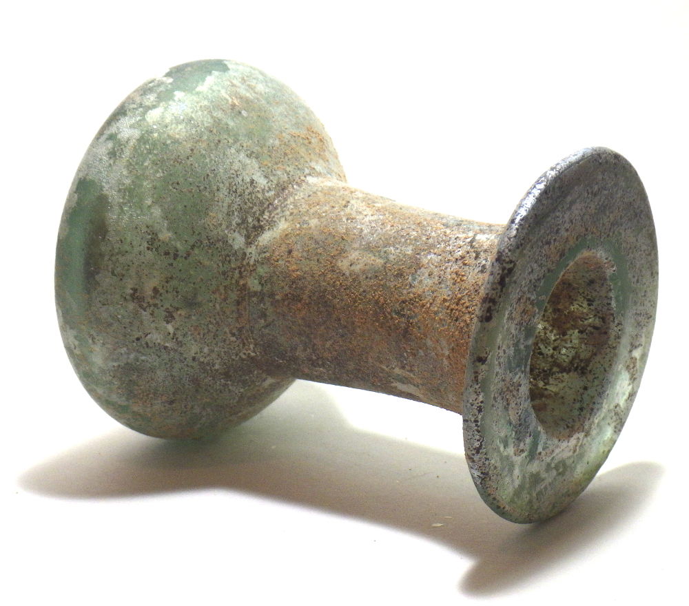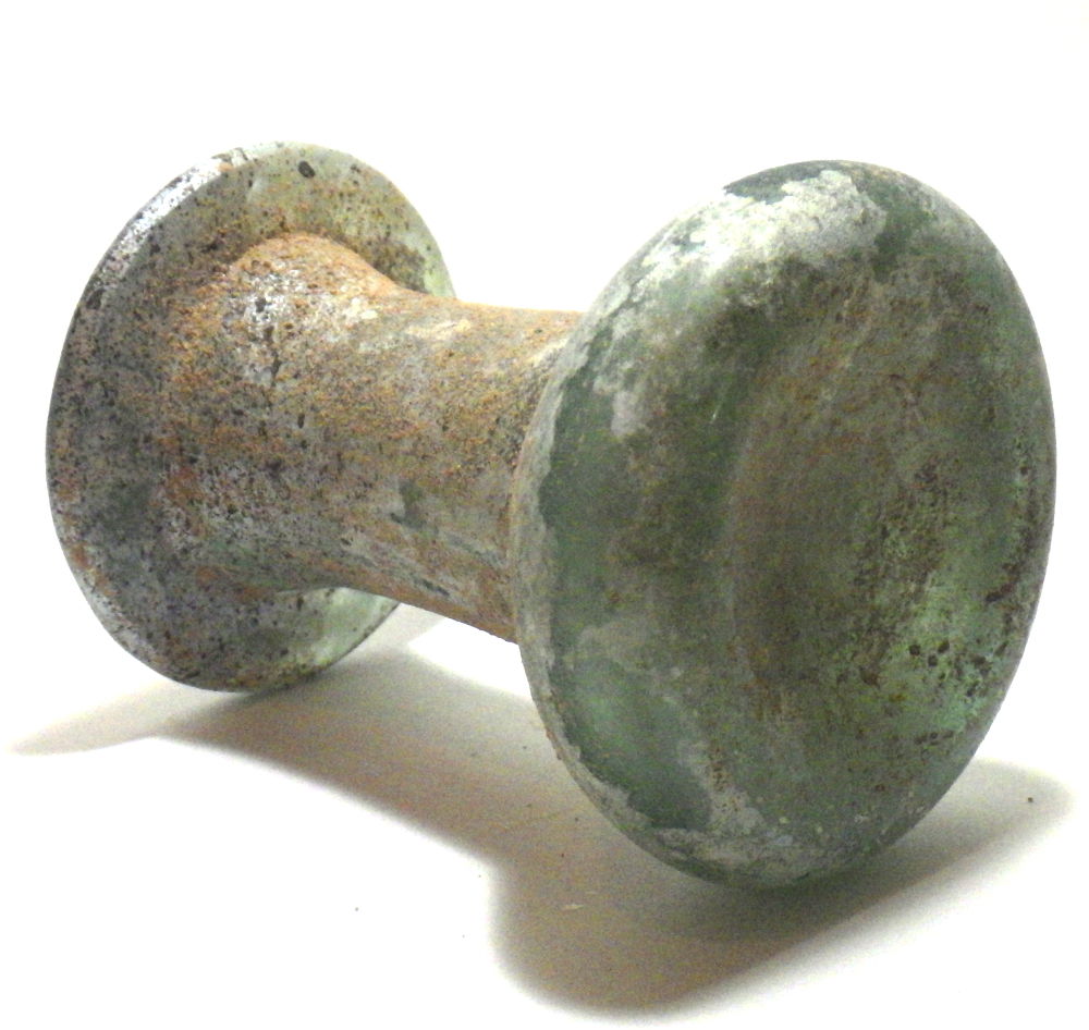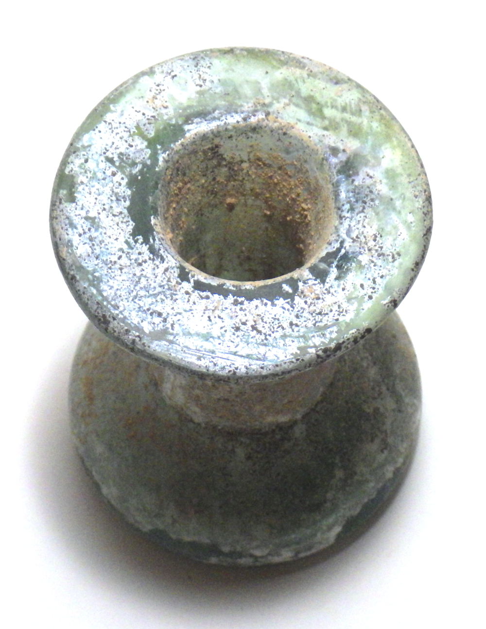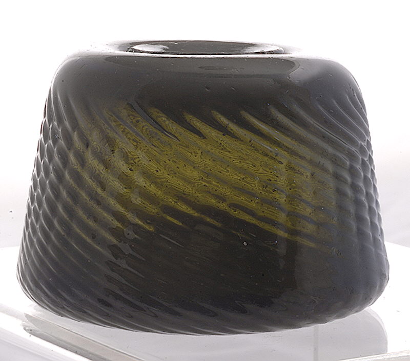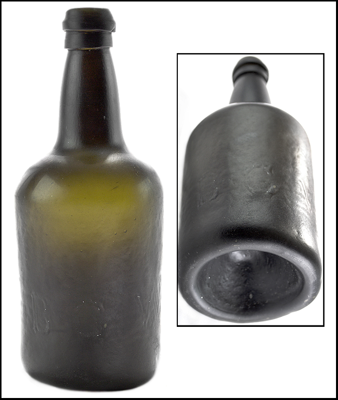 The early bottle pictured to the left, which is blob seal dated at 1727 (click 1727 seal to see a close-up of the seal), is heavily - and beautifully - patinated from several centuries of burial. It also, upon close inspection of the image (click image to enlarge), displays what appears to be swirling "straw marks" imbedded in the patination (see the straw marks discussion earlier on this page). This is an English bottle that is referred to as an "onion" bottle based on the squatty, bulbous shape. This bottle was free-blown, has an applied "string rim" type finish, and a sand or disk type pontil scar (click base view to see the bottle base). This style is briefly covered on the Liquor/Spirits Bottle Typology page, although it pre-dates the coverage time range of this website. (Photos from eBay®.)