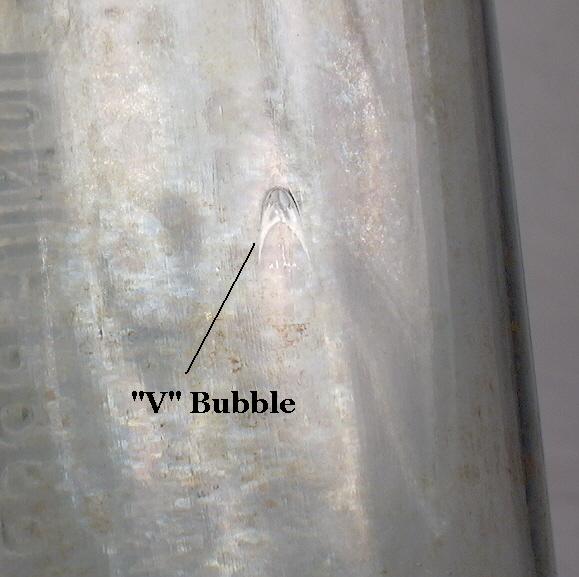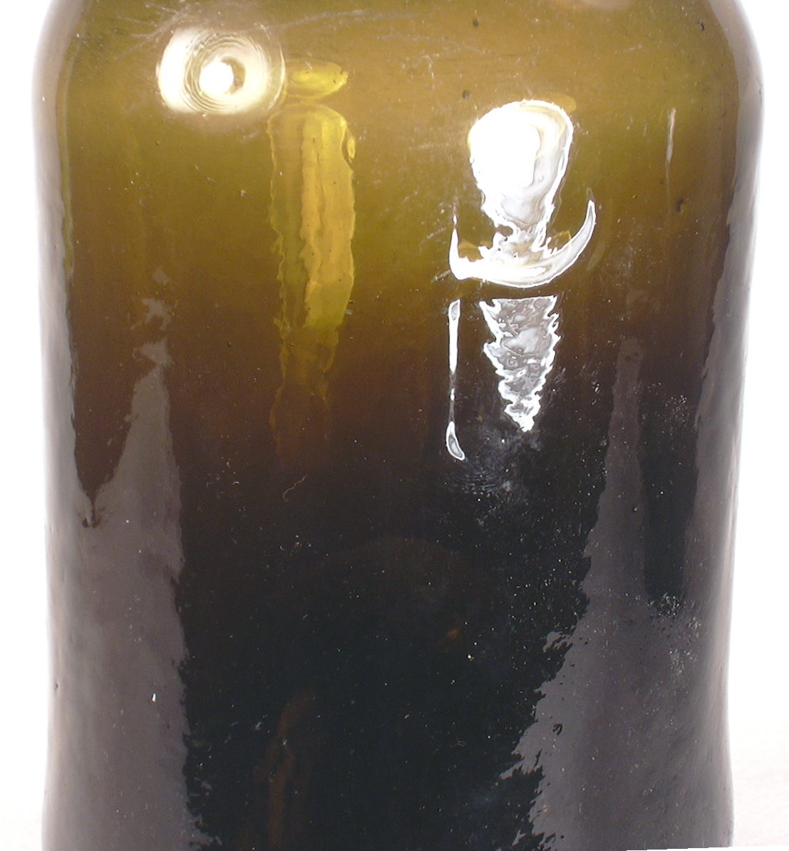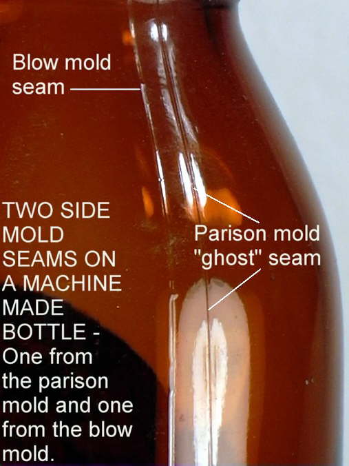 The body of a bottle has an assortment of characteristics or diagnostic features that can assist a person trying to date or at least tell a more complete story of a given bottle. The structure of this page covers three main categories of bottle body related features. The first category encompasses those that are induced by some process related to the manufacture of the bottle, excluding mold induced features. This includes various glass character features (e.g., bubbles, whittle marks) as well as bottle body attributes of bottles produced without a mold, i.e. free-blown bottle bodies. The second category includes the characteristics that are caused or induced in some way by the mold or molding process. This is the biggest category since most bottles manufactured during the time span covered by this website (early 1800s to 1950s) were produced in molds. The final category includes features induced to the bottle body after the blowing and molding has taken place, i.e. post-production features.