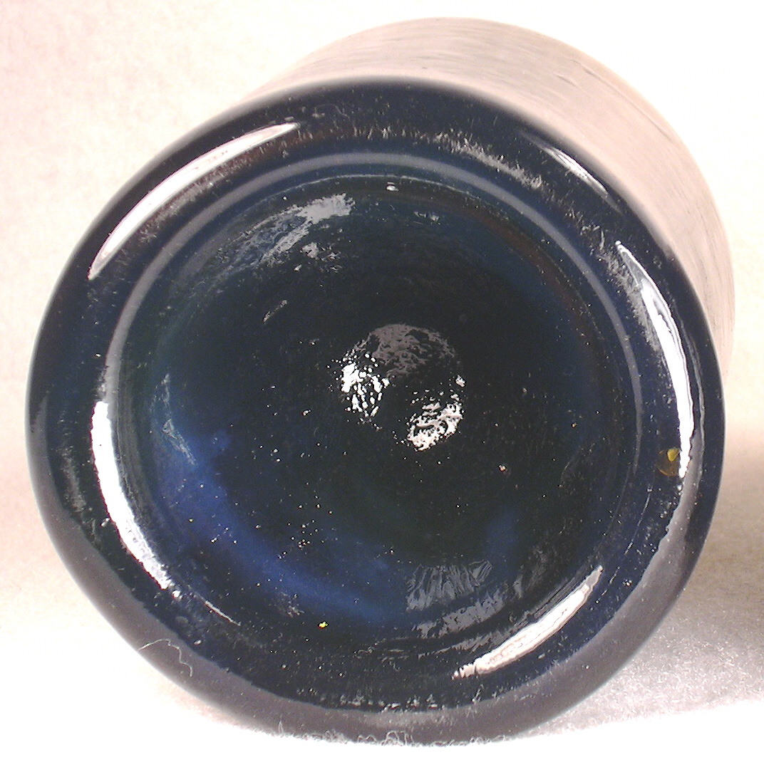 One additional observation is that the glass at the heel or base edge of a free-blown bottle will tend to be somewhat thicker than the rest of the bottle which will be fairly evenly distributed (last "bullet" above). In addition, the heel and extreme lower body of a free-blown bottle will often flare out somewhat with the base diameter being slightly wider than the average diameter of the bottle body. Both of these features are related and caused by a combination of the action of the tool that formed the push-up inside the base and the hot glass flowing or sagging as it was not contained by any mold surface (Jones 1983). This feature shows most distinctly with the bottle to the right in the picture. Bottles produced with a block and/or marver are typically (always?) round in cross-section and hard to differentiate from a purely free-blown bottle, though the latter method produces bottles with generally less symmetry. Block/marver produced bottles are considered with free-blown bottles here since they are largely indistinguishable from free-blown items and are still produced almost purely by the skill of the glassblower without the use of a dip or full-sized mold, both of which are covered later on this page (Kendrick 1968; Deiss pers. comm. 2005).