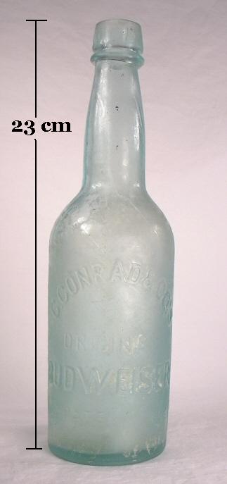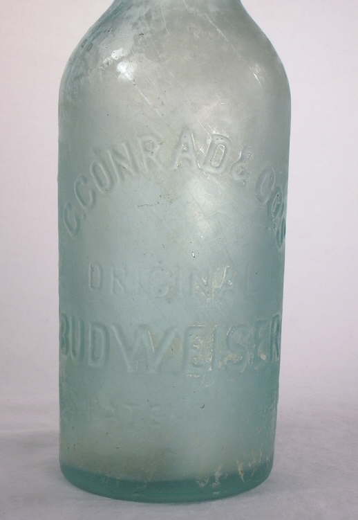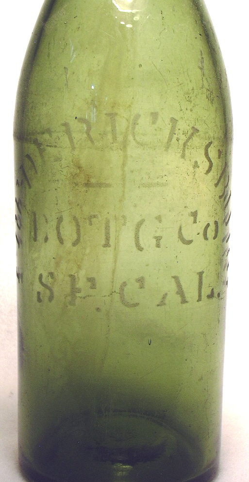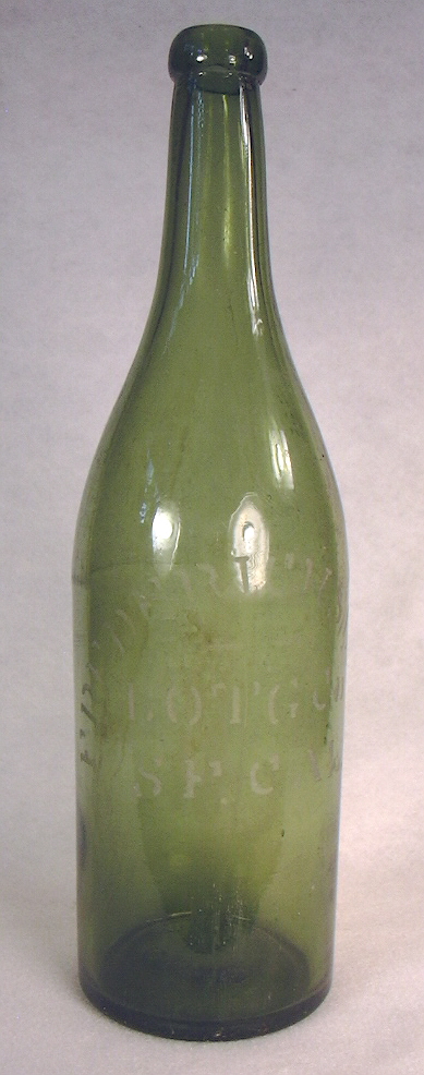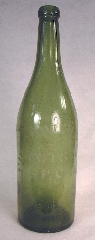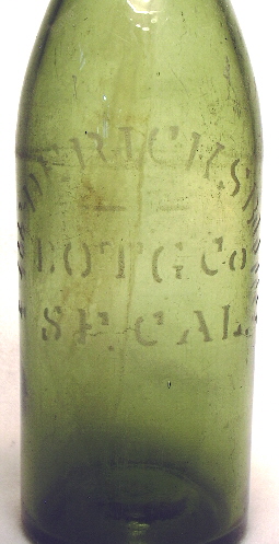 The pictured example is body engraved/etched with FREDERICKSBURG / BOTGCo / S.F. CAL. It is 11.5" tall, mouth-blown using the turn-mold process and has a narrow applied blob type finish. It likely dates from the 1890s or early 1900s (ca. 1890 to 1910) during the period (1889-1920) when the parent company was doing business as the Fredericksburg Brewing Co. (Van Wieren 1995). The "Bottling Company" - which has to be what the BOTGCo stood for - likely being an associated business or alternative name for use with other products, which may have included mineral water as that was what this style of bottle was typically used for. See the Apollinaris mineral water discussion on the "Soda & Mineral Water Bottles" typology page. This bottle also has substantial wear on the base as well as the body indicating it was reused many times - something that was common with beer bottles.
