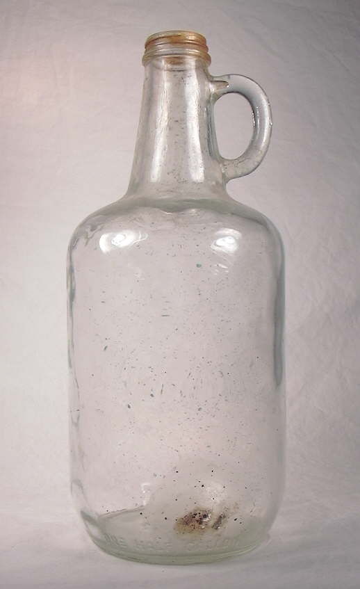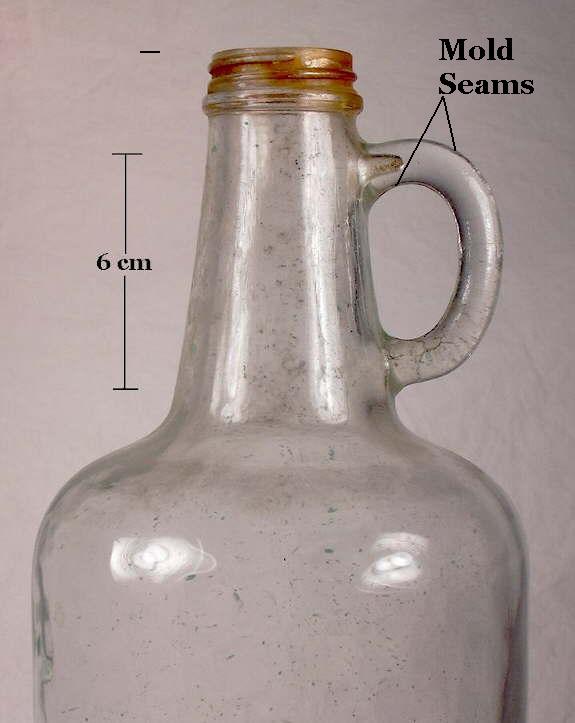 During the 20th century a wide array of machine-made bottles were made with molded - not applied - handles. This includes wine, liquor, bleach, and other types of bottles. Click machine-made handled jug to view a close-up picture of a handled wine jug that was manufactured in 1960 based on the Owens Illinois Company makers mark on the base. These type machine-made handled bottles have molded handles with mold seams running the entire length of the handle on the handles inside and outside edges (pointed out in the picture). Click handled jug to view a picture of the entire bottle.