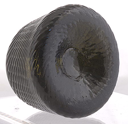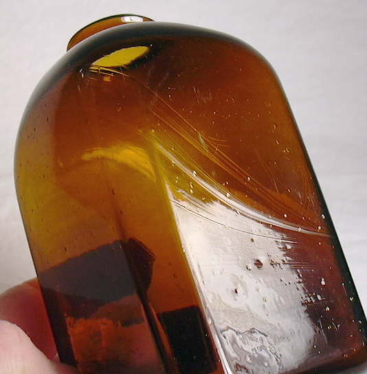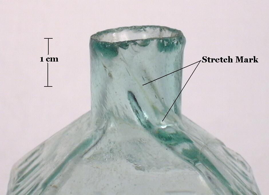 The picture to the left shows typical, though distinct, stretch marks in the neck of an early American liquor flask - the most common location for stretch marks in a mouth-blown bottle. Click Stoddard double eagle flask to view picture of this entire bottle which is a pint flask likely made at the Granite Glass Works (Stoddard, NH.) between 1846 and 1860 (McKearin & Wilson 1978). Neck/shoulder stretch marks are usually quite diagnostic of a mouth-blown bottle as they are rarely observed on machine-made items, though machine-made bottles - especially earlier ones - are observed with ripples or irregularities in the body of the bottle. The following empirical observations have been made in regards to the presence of stretch marks:
