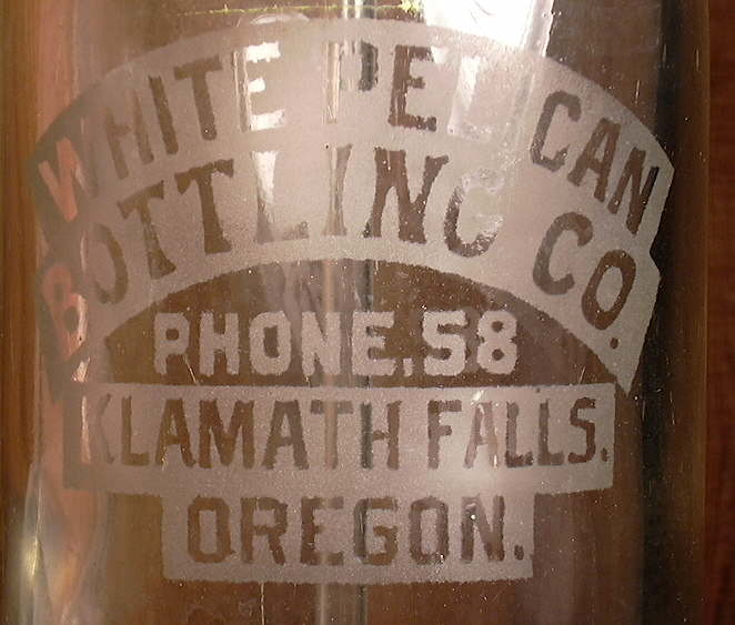 The very heavy/thick glass bottle pictured to the above left is of an early 1930s siphon bottle used in Klamath Falls, Oregon. The base of has an Owens-Illinois Glass Company marking indicating a 1931 production by the company which was formed in 1929 (Lockhart & Hoenig 2015, 2018t & 2018u). Click White Pelican Bottling Co. to see a close up of the etched lettering on this bottle. Etching was also used for druggists' "shop furniture" (large druggist display and dispensing bottles and globes) and infrequently for beer and soda bottles (Kendrick 1963; Elliott & Gould 1988; Jones & Sullivan 1989).