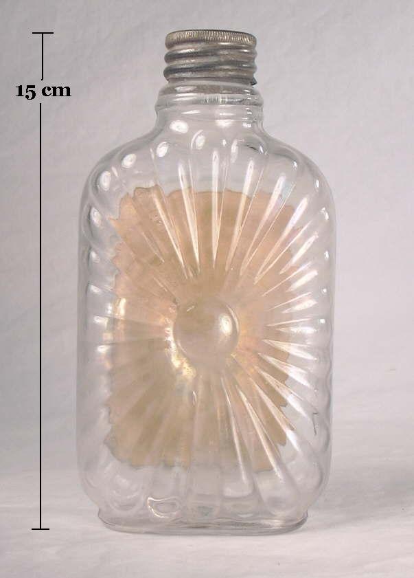 Based on listings in glass makers catalogs and empirical observations, mouth-blown, double screw cap flasks were made from the 1890s until National Prohibition after 1919. Some machine-made versions were likely made in the mid to late 1910s, though most machine-made double screw cap flasks were made after repeal of Prohibition in 1934. This design continues to be somewhat popular and versions are still being made today.