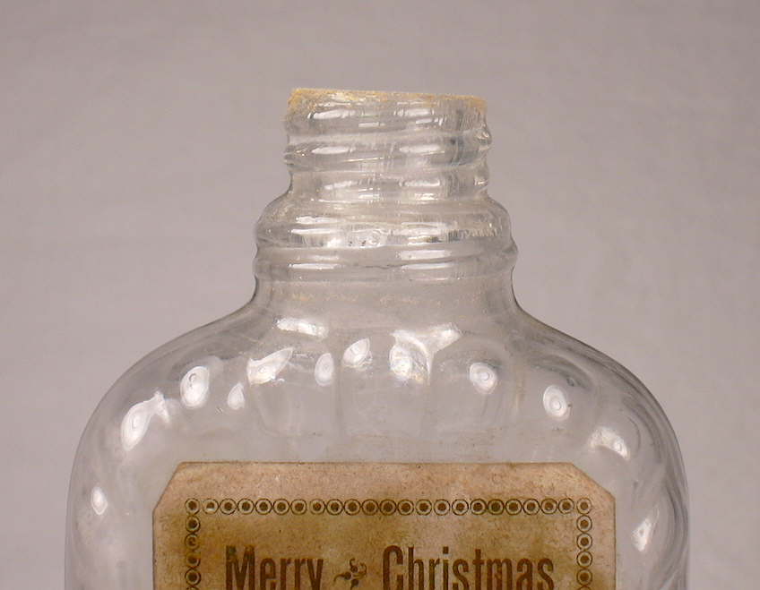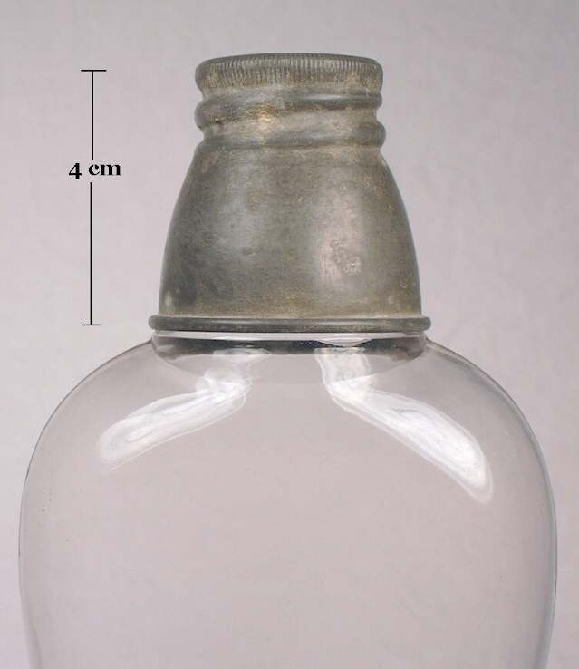 These flasks are always mouth-blown and when made in the pint size in amber glass they date between 1877 and about 1880. In the pictured half pint size in colorless glass (sometimes amber glass) the flasks date from the 1880s and possibly 1890s (Wilson & Wilson 1968). These flasks are not often seen, but are common enough to warrant mention. It has also been established that these uniquely shaped flasks were made by glass companies outside of San Francisco since one example firmly dated from 1880, has Baker Bros. & Co. (proprietors of the Spring Garden Glass Works, Baltimore, MD.) embossed on the base along with regular base embossing noted earlier (Baab 2005). Since these flasks were always mouth-blown, the top surface of the external screw thread finish (the rim) is ground flat; click Newman finish close-up to view a close-up picture of the threads and ground rim.