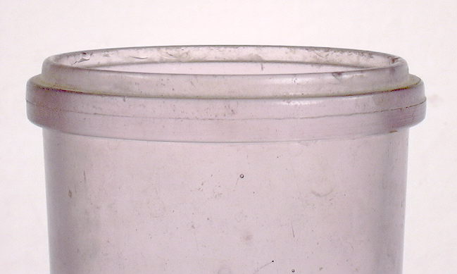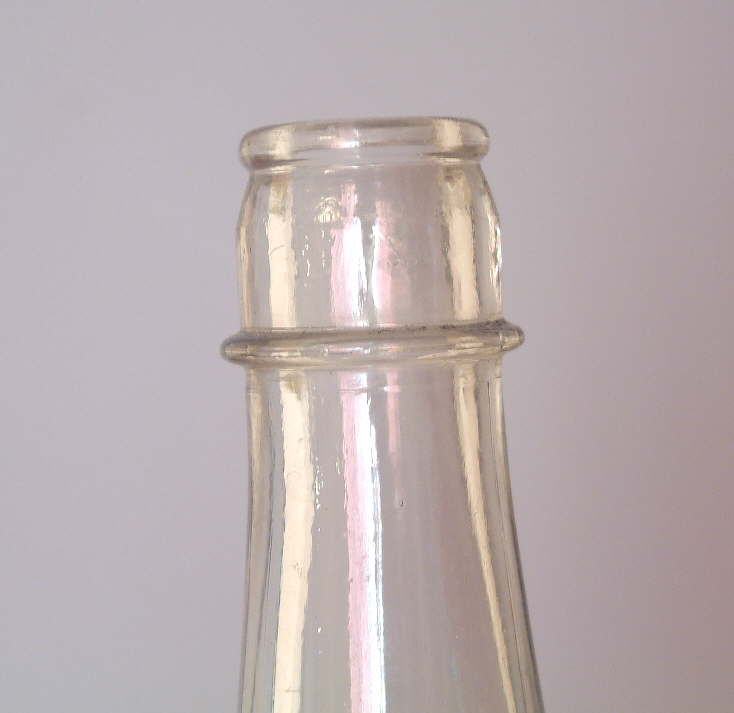 The one-part finish that accepts this closure - also referred to as the "common sense" finish - has a relatively wide bore (mouth) in which there is an edge or ridge about 1/2 cm (1/4") below the inside edge of the rounded finish - see image to the right (Rawlinson 1970). This ridge is where the disposable paper/cardboard cap (usually wax coated) sat to seal the contents from contamination. The bore (inside diameter of the mouth) of most capseat finishes made from the 1910s on are the same diameter - approximately 1 5/8" (42mm) wide. Earlier milk bottles - including mouth-blown examples with hand tooled finishes - varied more in the size of the bore and different size caps were made for them, although the noted size was also commonly used (Tutton 1994). The paper disk was easily removable and easy to put back in the mouth of the milk bottle protecting the contents until the next use. Since milk has a very limited life span, the paper disk only had to last a week or so and were not designed for durability. As the pictured milk bottle to the left shows (click to enlarge), the prying of the cap out of the bore of the bottle with a knife or other pointed implement often resulted in chipping or small pressure cracks or "flashes" to the glass on the rim of the finish.