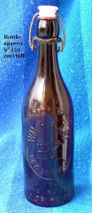 The picture to the far right shows an early 20th century (1900-1910) King's Pure Malt "beer tonic" bottle (Boston, MA.) with a blob finish and the cork in place. Though somewhat loose now, the wire that held the cork secure is also still present. The upper, thicker wire looped over the top of the cork (which was pushed in level with the top of the bore) and was held tightly in place by the smaller wires tightly (originally) encircling the neck just below the lower portion of the finish. This type closure is called a "wired cork stopper." Another popular type of simple cork retainer was the more solid wire Henry Putnam patented (1859) design as pictured below. This type wire bail had the benefit of being reusable and was particularly popular on soda and mineral water bottles during the 1860s through 1880s like the Hoffman & Joseph "blob-top" soda pictured which dates from the mid-1880s (Fowler 1981). The utility of the blob type finish was that it provided a large ridge for properly securing the wire below the finish. Many variations on these basic themes can be found on 19th and early 20th century cork sealed bottles (Lief 1965; Jones & Sullivan 1989; Graci 2003).