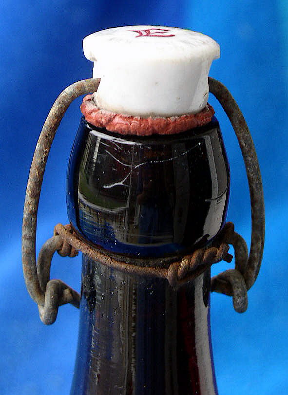 With carbonated beverages (soda, beer, champagne) the cork had to be secured more positively to prevent the content pressure from loosening the cork and slowly leaking the carbonation or even popping out prior to consumption of the contents. To accomplish this some type of tightened wiring or strong cord or string was wrapped in various ways around the upper neck and finish area with a portion looping over the cork to maintain it securely in the bottle.