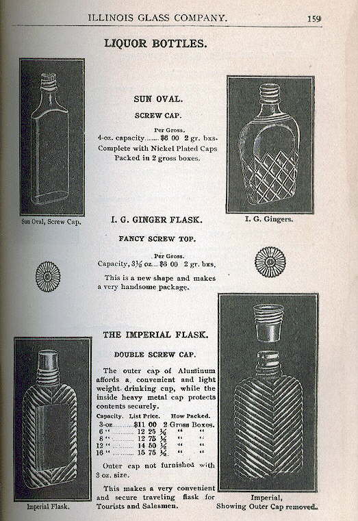 The pictured mouth blown double screw cap flask was called an "Imperial Flask" by its likely producer. It is approximately 6 ozs. in size and was almost certainly produced by the Illinois Glass Company between the late 1890s and the early to mid 1910s. It is not makers marked with the symbol for this company, but was specifically listed and illustrated in the companies catalogs during the listed period of time (Illinois Glass Company 1899, 1903, 1908, 1911). Click Imperial Flask in IGCo. catalog to see a page from the 1908 Illinois Glass Company catalog that shows this specific flask in various sizes with the same exact caps as shown in the picture. The catalog also notes that "This flask makes a very convenient and secure traveling flask for Tourists and Salesmen." No wonder Prohibition was passed!
