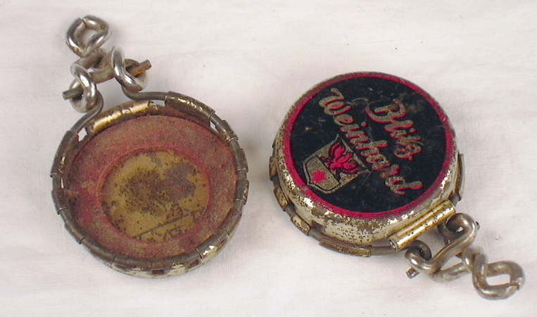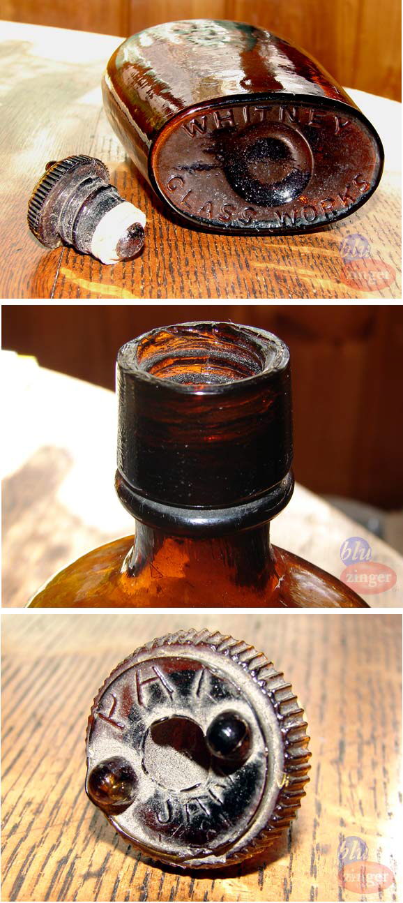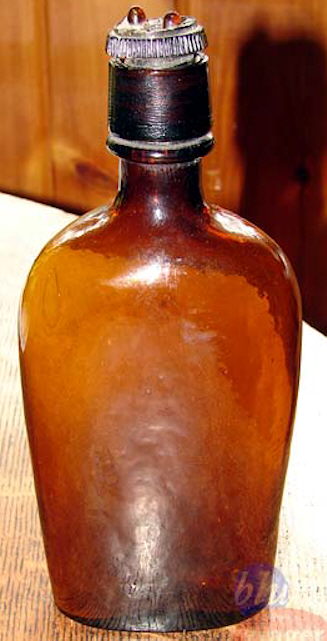 The majority of liquor flasks produced during the period covered by this website (1800 to 1950s) used either cork (generally pre-1920s), externally threaded screw caps (generally post-1920s but not uncommon as early as the 1890s), or much less frequently some of the closures already noted above. There were, however, a couple other closure types that were utilized on liquor flasks but are rarely if ever seen on other types of bottles. A couple of these unusual closures are covered below.