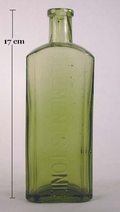 -Olive green glass was very uncommon after about 1900 in most types of American made bottles except some liquor bottles (e.g., scotch whisky) and, of course, wine/champagne bottles which still are made in olive green. One observation is that the newer (after about 1920 or so) wine & champagne bottles tend to have a "brighter" olive green than the more subdued olive green prior to that time. This color difference would only be evident with much experience looking at such bottles and is not absolute. -The olive colors are most commonly found in the following type (age) of bottles: wine/champagne (any age), mineral water (1880s and before - particularly in the "Saratoga" types), ink (1880s and before), snuff (before about 1870), medicinals (1860s and before), beer & ale and all types of liquor (prior to 1910), figured flasks (prior to 1870), and some foods (1880s and before). -Olive green and olive amber are uncommon colors for soda water bottles after about 1870 (not real common before that), canning jars, medicine bottles after the 1860s, perfume/cologne bottles, druggist bottles during any time period, and poison bottles. (Covill 1971; Wilson 1972; McKearin & Wilson 1978; Zumwalt 1980; Tucker 1986; Odell 2000) |