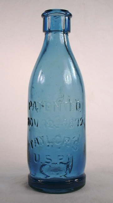 The medium sapphire blue bottle to the right is embossed on the front with Crystal / Soda / Water Co. which was in San Francisco, CA. These were almost certainly made at the San Francisco & Pacific Glass Works and date from between 1873 and 1886. The applied finish on this bottle is somewhat of a modified blob with a slightly wider ring near the upper end of the lip. This unusual bottle also has a pedestal base. The actual closure for this bottle was likely a cork and the ring finish a stylistic feature like the base, though this is not known for sure. Some versions of this bottle (not this example) have a hole on opposing sides of the finish in which a metal pin was pushed through to secure the cork (Markota 1994). The reverse side notes that the bottle and/or closure was a result of "Taylor's U.S. PT." (patent) which was "Patented Nov. 12, 1872." Click Crystal Soda Water reverse for a picture of the reverse side of the bottle showing this embossing. (This bottle is discussed more on the Soda & Mineral Water typology page as well as in this article: Crystal Soda Water article (Lindsey 2009.) Diagnostic/Dating Utility: The presence of the various noted blue colors has limited dating and typing utility because of the wide application of the colors for various products. Though not a common color when compared to aqua, amber, and the greens, cobalt and sapphire blue can be found to some degree in virtually any type of bottle from inks to figured flasks to beer bottles to even occasional food bottles (Covill 1971; Martin 1973; McKearin & Wilson 1978; Zumwalt 1980). These blue colors are somewhat more common in certain classes of bottles like those intended for poisonous substances and cosmetics. An example of the former would be the relatively common early 20th century Owl Drug Company poisons - click Owl poison bottle for an image of an Owl poison. These blue colors were also frequently used with soda and mineral water bottles from the 1840s into the early 1900s and ink bottles from from the 1840s into at least the 1930s (Schmeiser 1970; Covill 1971; Markota 1994; Faulkner & Faulkner 2009). |