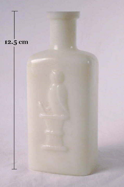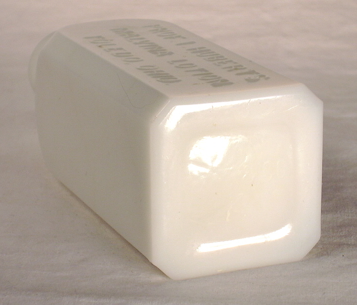 A typical cosmetic bottle example is the Owl Drug Company lotion (and likely other cosmetic products) bottle above which dates from the around 1895-1910 (Jensen 1967; Fike 1987). Click milk glass Owl Drug with label to see an example with the original label showing that particular bottle contained "rose water" which was a distillate of rose petals - a type of natural perfume. Many of the milk glass druggist style or type bottles (like discussed next) were most likely for that particular druggist's cosmetic products as milk glass was well linked with cosmetics in customers minds (Fike 1987; Cannon 2004). Another often encountered milk glass bottle is pictured to the right. It is embossed with PROF. I. HUBERT'S /MALVINA LOTION / TOLEDO, OHIO. The bottle is 5" tall, of the "French Square" druggist bottle style (square with beveled corners), mouth-blown with a tooled prescription finish, has single air venting marks on opposite non-mold seam shoulder corners and was blown in a cup-base mold. It is faintly embossed on the base with W. T. & CO. / (undecipherable letter or number); click base view to see such. That was one of many different makers markings used by Whitall, Tatum & Co. (Millville, NJ.) whom operated under that company name from 1857 to 1938 (Toulouse 1970). The noted base marking orientation dates the bottle between about 1880 and 1895 (Lockhart et al. 2006b) which in hand with the noted air venting helps confirm manufacture between those dates. Click more information on Hubert's Malvina Lotion to view the discussion on the "Household Bottles" typology page. Milk glass was infrequently used for ink bottles, bitters, non-cosmetic medicinals, liquor, and sometimes even fruit and food jars primarily during the late 19th and early 20th century. Milk glass is virtually unknown in the production of soda, mineral water, wine/champagne, and beer bottles. It was rarely used for bottles prior to about 1870, i.e., milk glass bottles/fragments would not commonly be found on historic site's that date totally prior to the 1870s. An interesting aspect of some milk glass is that it was made with manganese dioxide in the glass batch. This interesting milk glass will react to sunlight - as described in the colorless glass section above - producing a milky lavender color. This has primarily been observed in cold cream and other cosmetic jars from the first couple decades of the 20th century, though it is seen in occasional bottles. It sometimes appears that the lavender color was produced purposefully (with a UV light or radiation) so it is not always possible to differentiate between sun colored and intentionally colored lavender milk glass. |
