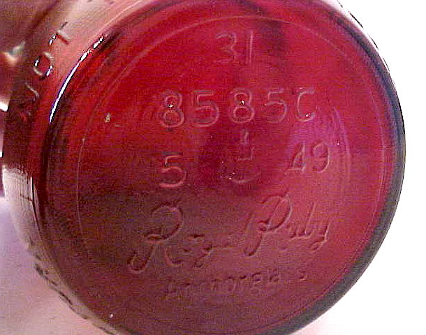Diagnostic/Dating Utility: These true purple/reddish/amethyst colors (not sun colored amethyst) in bottles are primarily found in the era between the 1840s and early 1880s; they are rarely noted in bottles that date before or after that date range (empirical observations). The deep reddish amethyst colored bottle in the left corner above is a Mrs. S. A. Allen's World's Hair Restorer (New York) which dates from the 1870s. Hair treatment bottles are one of the few classes of bottles in which the purple/amethyst colors are fairly commonly found. Other classes of bottles where these colors occur with some frequency (though still not commonly) is figured or pictorial flasks, bitters (particular those which are "barrel" shaped like the bottle to the right), and some types of ink bottles. The bottle to the immediate right is an Old Sachem Bitters and Wigwam Tonic (New York) which likely dates 1860-1870. It's color would be described as medium amethyst. (This photo courtesy of Jeff Noordsy Antiques.) True red - ruby red - utilitarian bottles are only known to the author as having been used for bottling Schlitz™ beer at various times - and in various period beer shapes - from the late 1940s to early 1960s (empirical observations). An image of a Schlitz™ quart stubbie style beer bottle is to the far right just above. Click base view to see such showing the makers mark for the Anchor Hocking Glass Co. who made all of these esthetically colored bottles for Schlitz™. The base photo also shows the "49" date code indicating production in 1949. (Photos from eBay®.) |