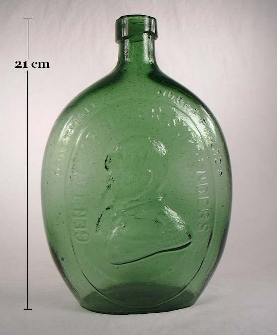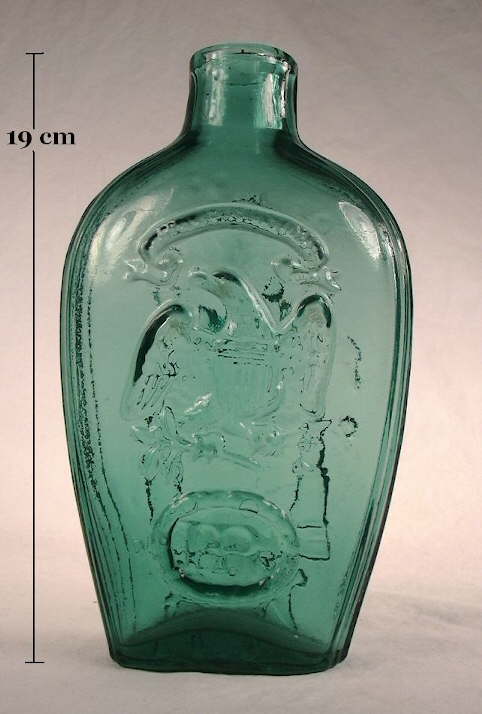 The flask below left has a color that could be described as clear yellow-green or possibly light to medium emerald green. This quart flask is a figured or pictorial Washington-Taylor flask (Philadelphia, PA.) which was likely blown just before or during the American Civil War - late 1850s to early 1860s (McKearin & Wilson 1978). (This flask, which is classified as GI-37 by McKearin & Wilson, is discussed more on the Liquor & Spirits Bottle typology page.)