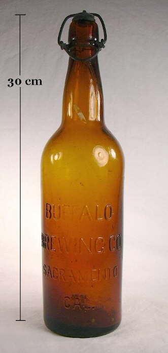 As with the other major colors noted, there are many amber variations and names for those variations. Commonly used terms include yellow, yellow amber, golden amber, red or reddish amber, honey amber, "old" amber (yellowish amber with a greenish tint), olive amber (covered above), etc. As with the other colors, the general degree of density and color can also be described with modifier terms like deep, dark, medium, light, bright, etc. The quart beer bottle to the far left above is a typical medium amber color - not too dark and not too light. It is a Buffalo Brewing Company (Sacramento, CA.) bottle that dates between 1890 and 1902. That date range determination for this bottle is discussed on the Finish Types & Styles page; click Finish Types & Styles to review that discussion. The unusual bottle with an applied handle to the right of the previous bottle above has a color best described as reddish amber; the reddish tint is subtle but distinct in the picture. It is a Wharton's Whiskey (Philadelphia, PA.) that was was blown at the Whitney Glass Works (Glassboro, NJ) around 1860 (McKearin & Wilson 1978). Applied glass handles were an unusual feature added to some fancy liquor bottles primarily during the mid-19th century (1850-1870), though a few were made to at least as late as the 1890s (Wilson & Wilson 1968). (This handled liquor bottle is discussed more on the Liquor & Spirits Bottles Typology page.)
