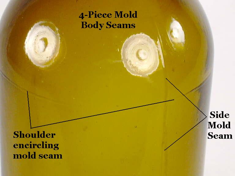 This theory is found in Kendrick's chapter on "The Applied Lip" which contains a chart (Figure 9) entitled "Age Gauge: Mold Seams of Bottles." Kendrick's explains in the text (page 45-47) that "It is true that the mold seams can be used like a thermometer to determine the approximate age of a bottle. The closer to the top of the bottle the seams extend, the more recent was the production of the bottle." The chart accompanying this statement notes that bottles made before 1860 have a side mold seam ending on the shoulder or low on the neck, between 1860 and 1880 the seam ends just below the finish, between 1880 and 1900 the seam ends within the finish just below the rim, and after 1900 the seam mold seam ends at the top surface of the finish, i.e., rim (Kendrick 1963).