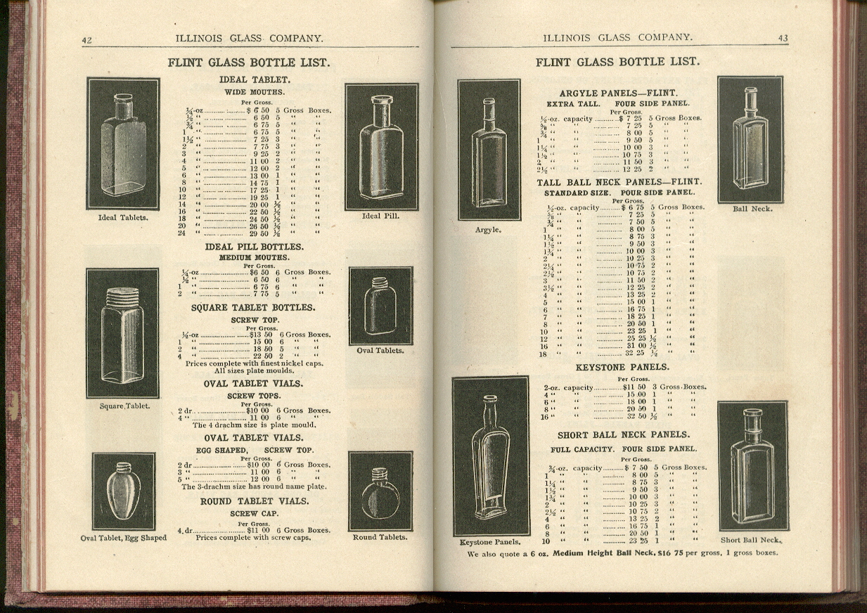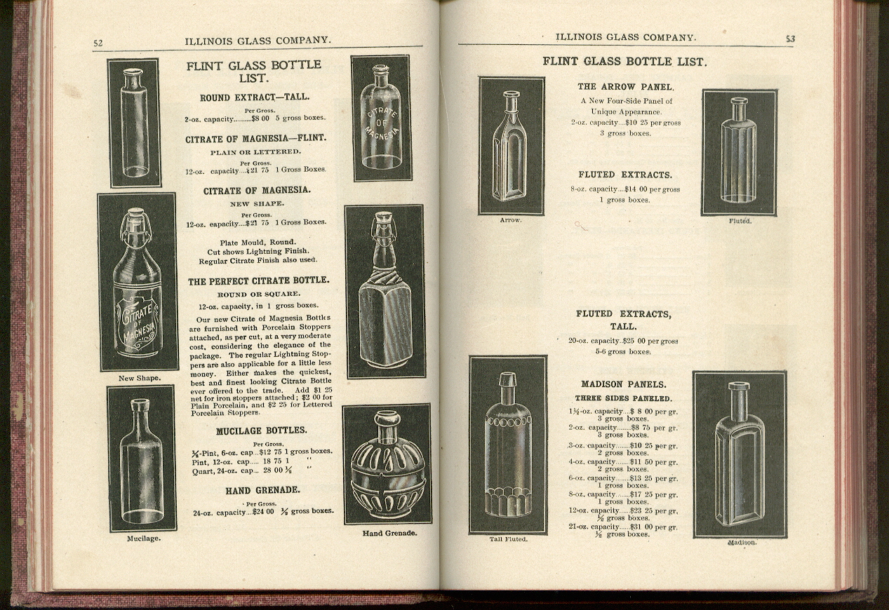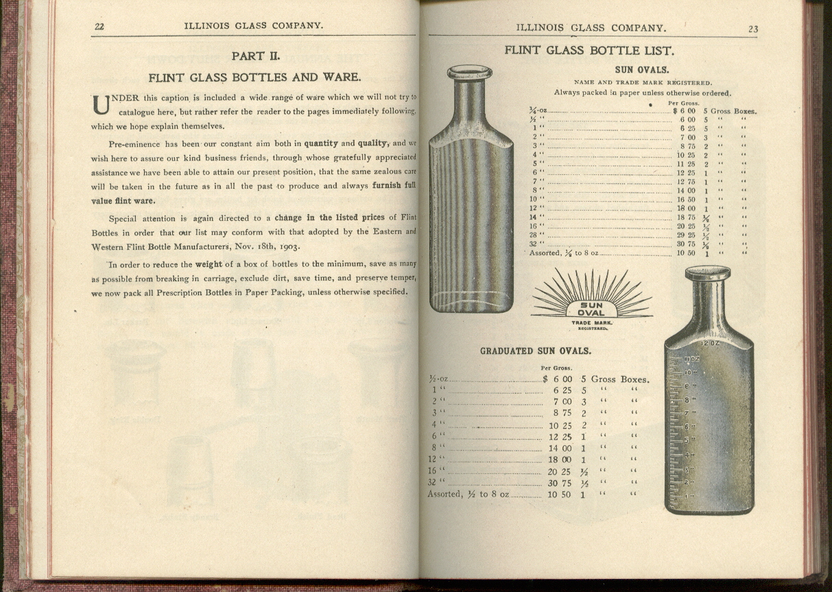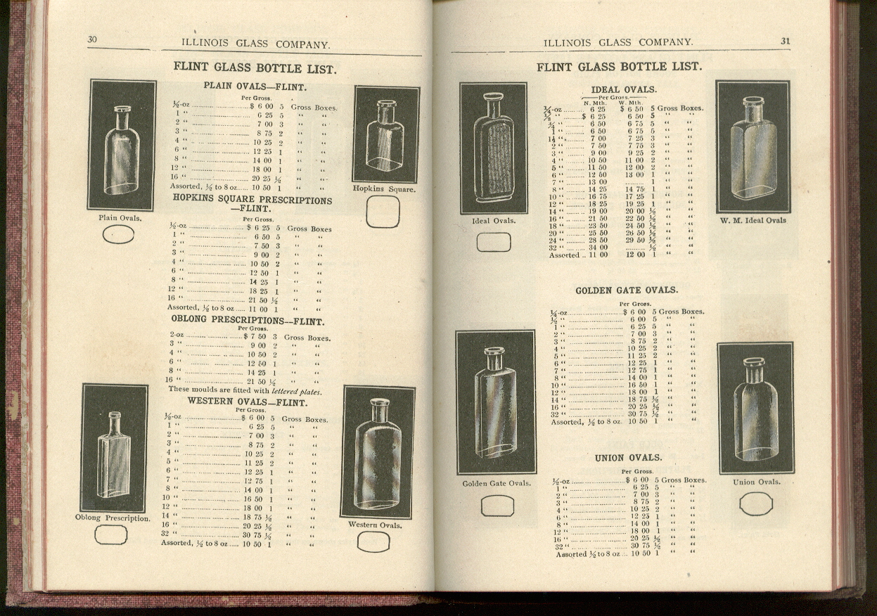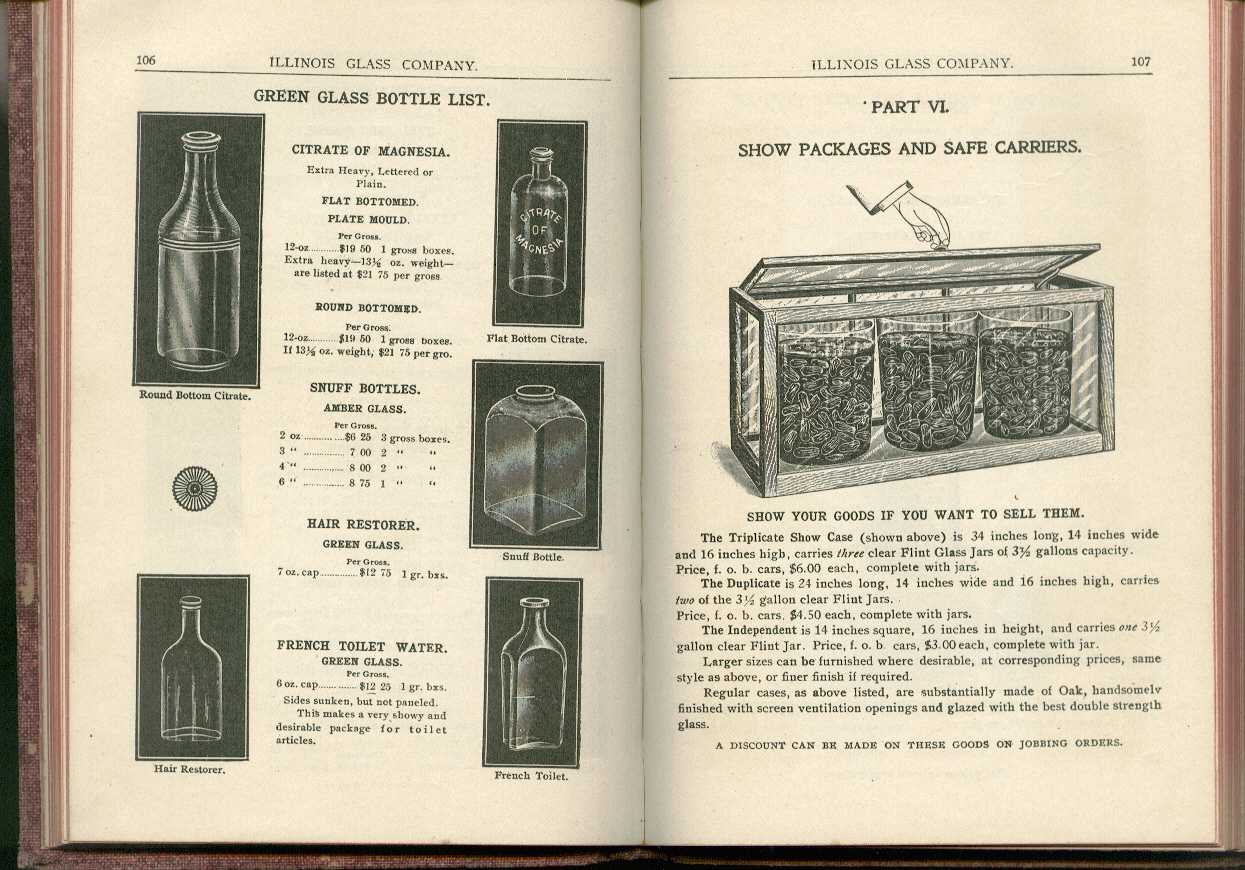 Because of this utility I have reproduced the entire 1906 Illinois Glass Company (IGCo.) catalog on this website; a catalog never reproduced to the authors knowledge. The IGCo. was one of the largest producers of bottles during the late 19th and early 20th centuries (and still is in its current manifestation as the Owens-Illinois, Inc.©) having almost certainly the most comprehensive array of offerings of any bottle maker at the time within all important bottle type categories. Given this dominance, the bottle styles listed in their catalogs - and to a large degree the style names used - are typical of the offerings of most bottle makers of that time making the IGCo. catalogs one of the more important catalogs of the era to researchers.