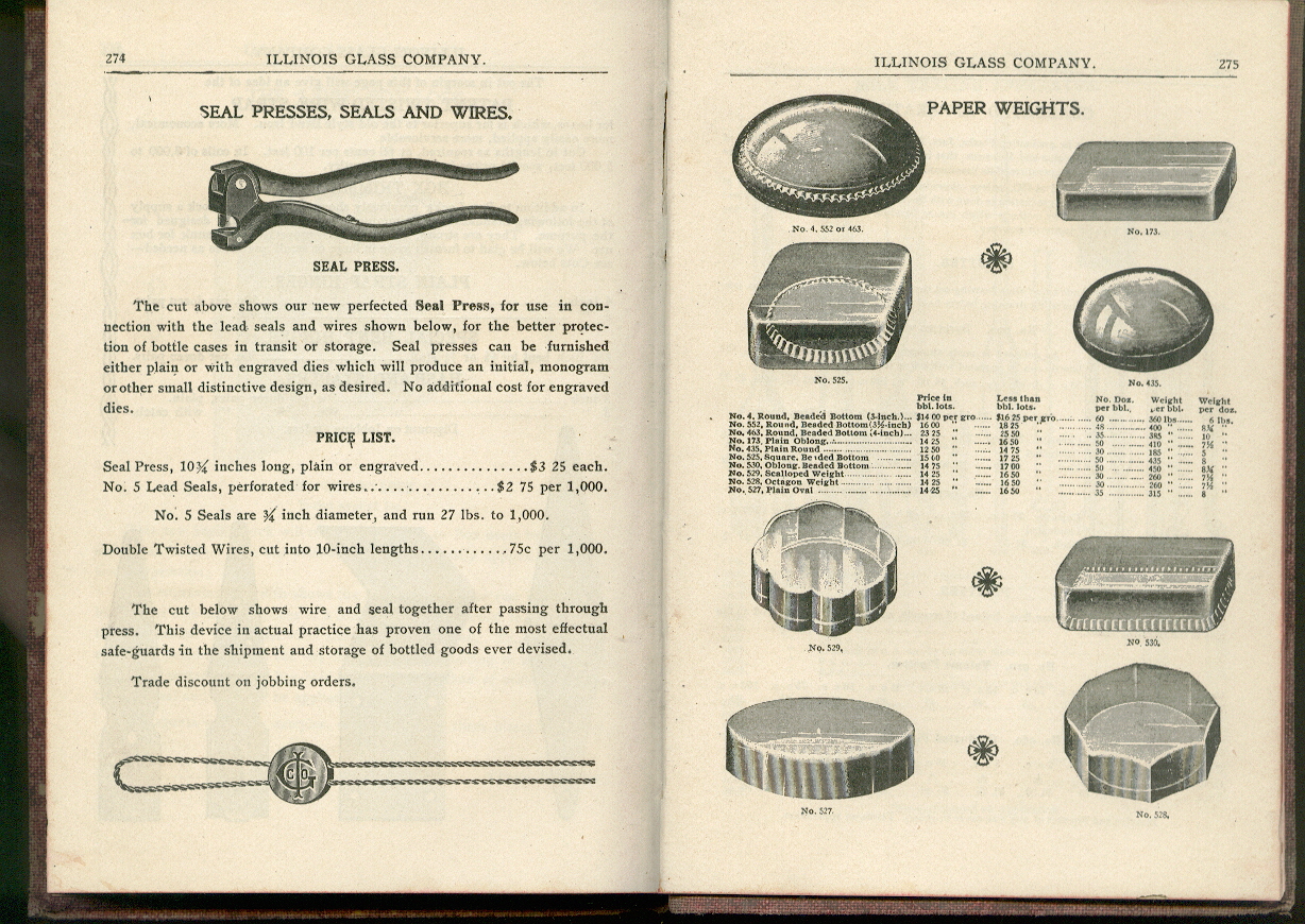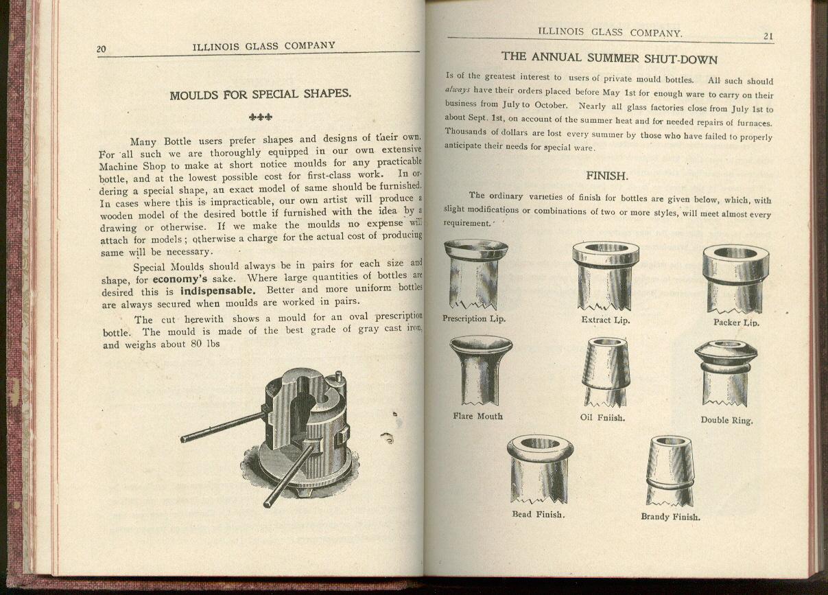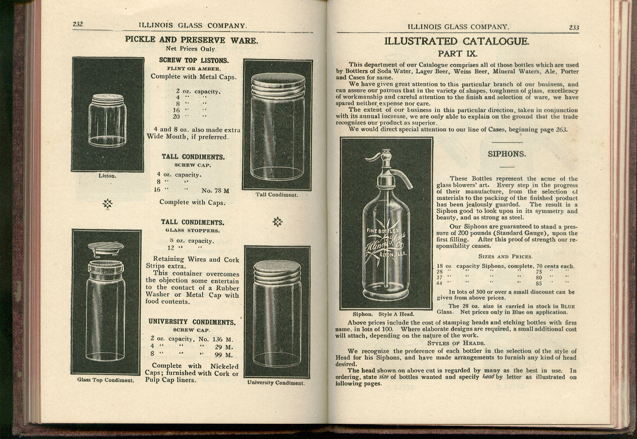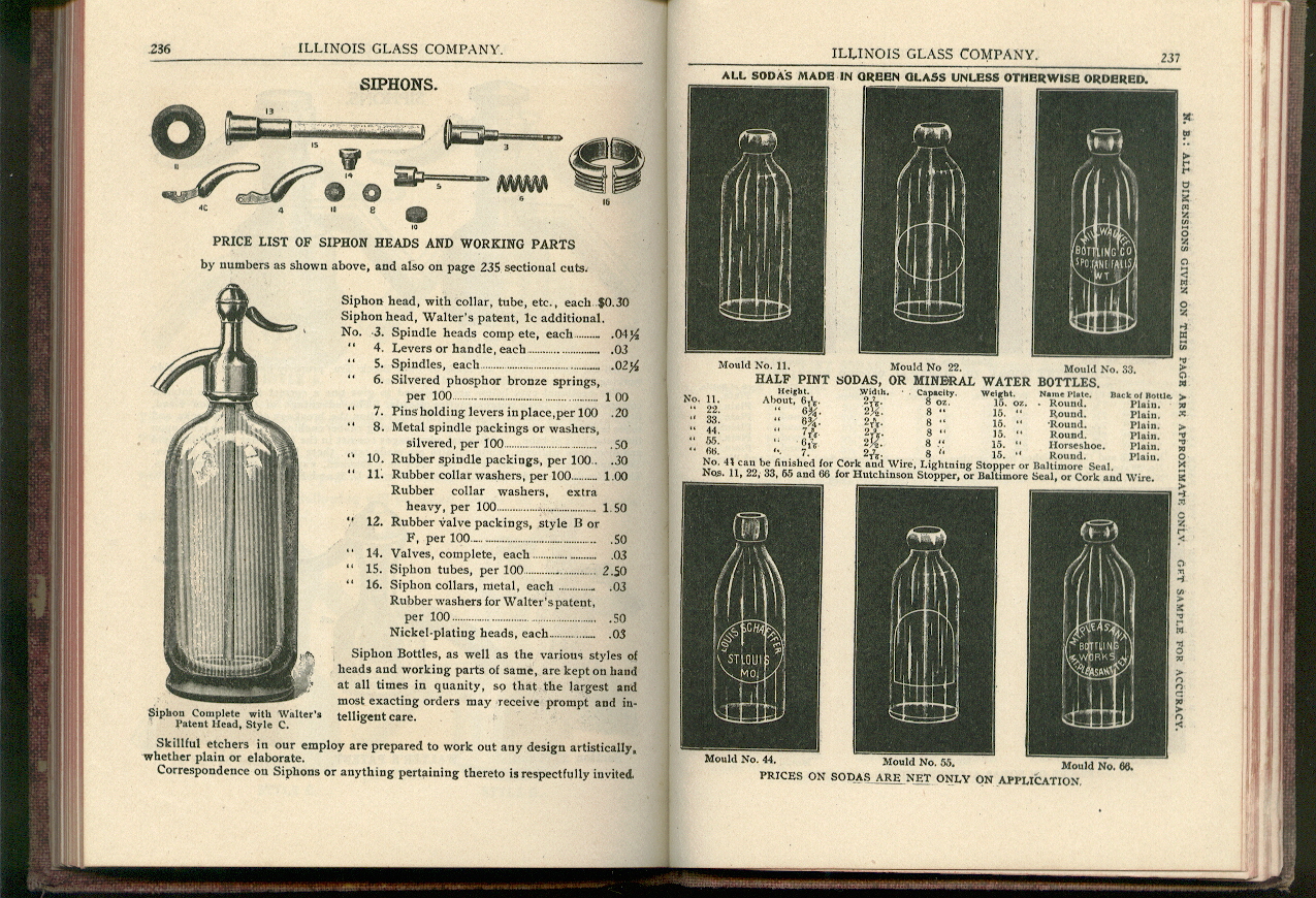 Lockhart, Bill, Pete Schulz, Beau Schriever, Bill Lindsey, and Carol Serr with contributions from Russ Hoenig and David Whitten. 2016p. Illinois Glass Company. Historic Glass Bottle Identification & Information Website, E-published August 2016. Article on probably the largest bottle maker during the last third of the 19th through the first quarter of the 20th century. This updated article is available at this link: https://secure-sha.org/bottle/pdffiles/IGCo.pdf This article is part of the Encyclopedia of Manufacturers Marks on Glass Containers. This article also has an appendix of soda bottle mold/catalog codes used from 1896 to 1920. It is available at this link: Appendix A - Illinois Glass Co. Catalog Codes (Mold Numbers) for Soda Bottles 1896-1920.
