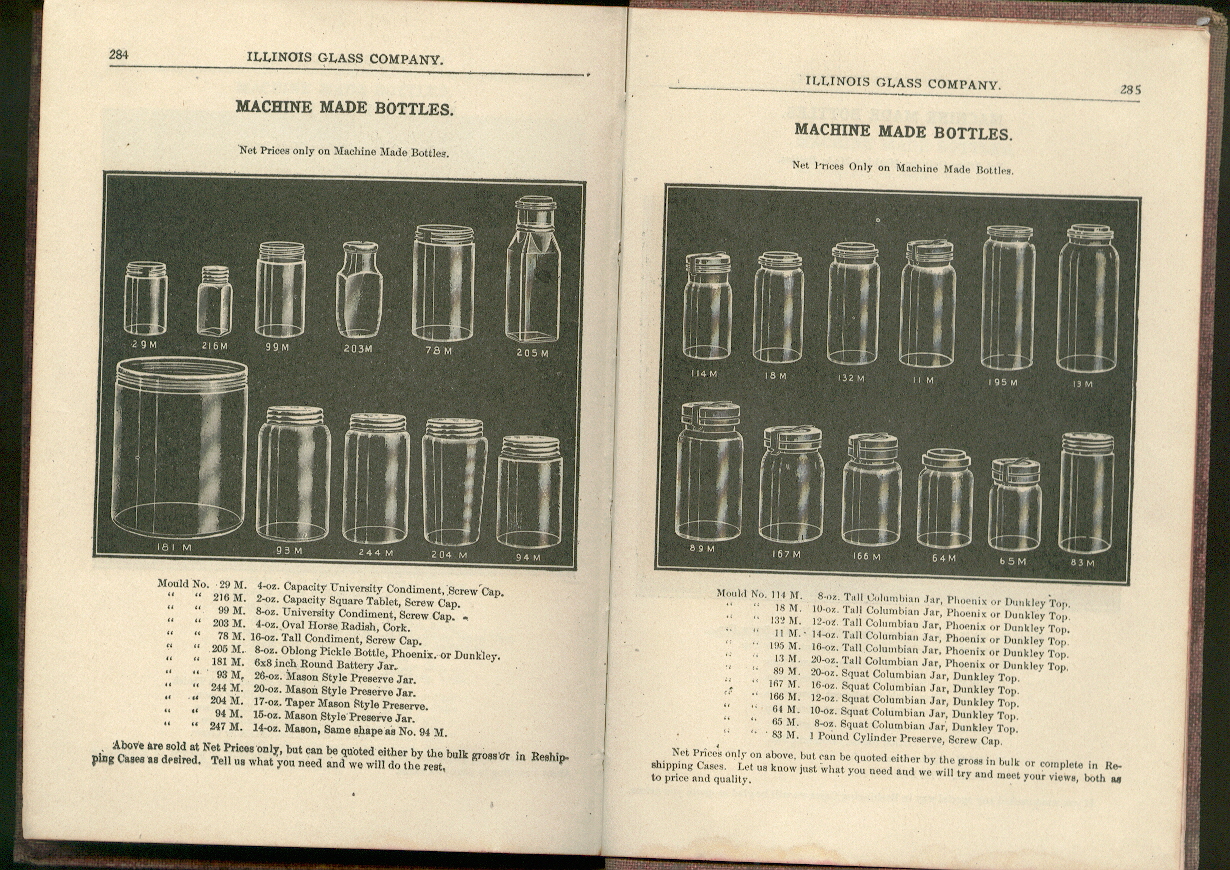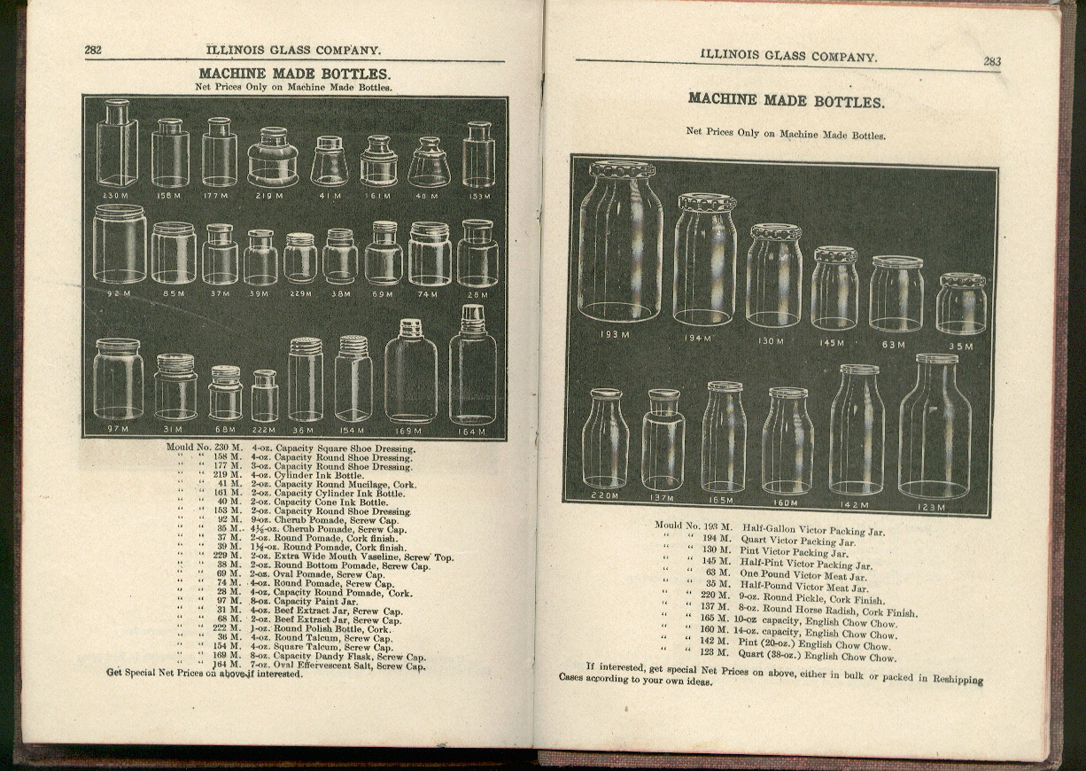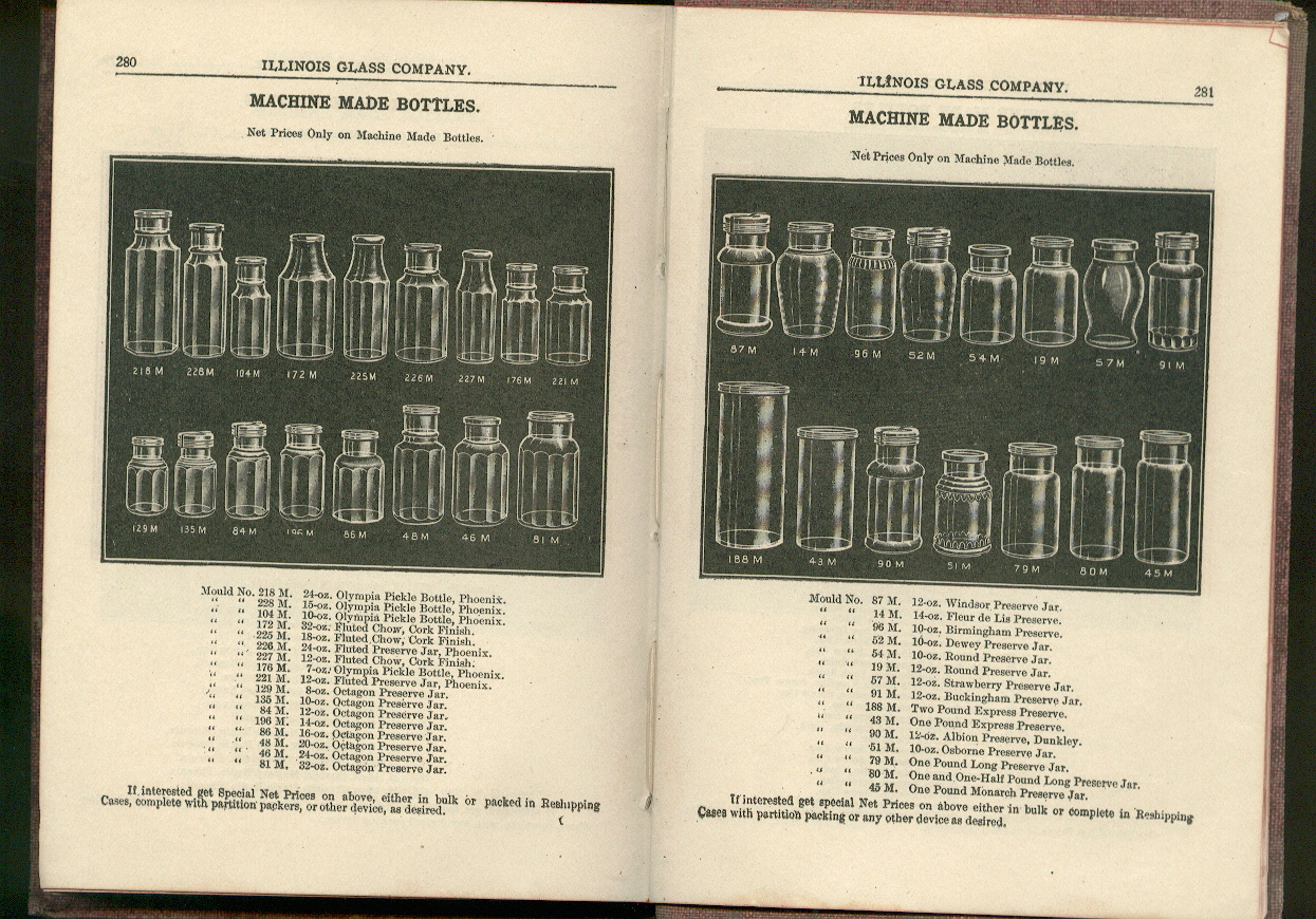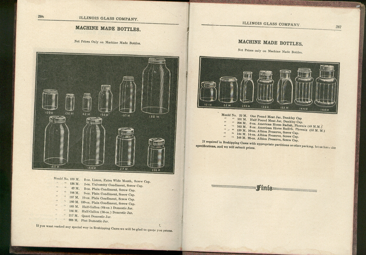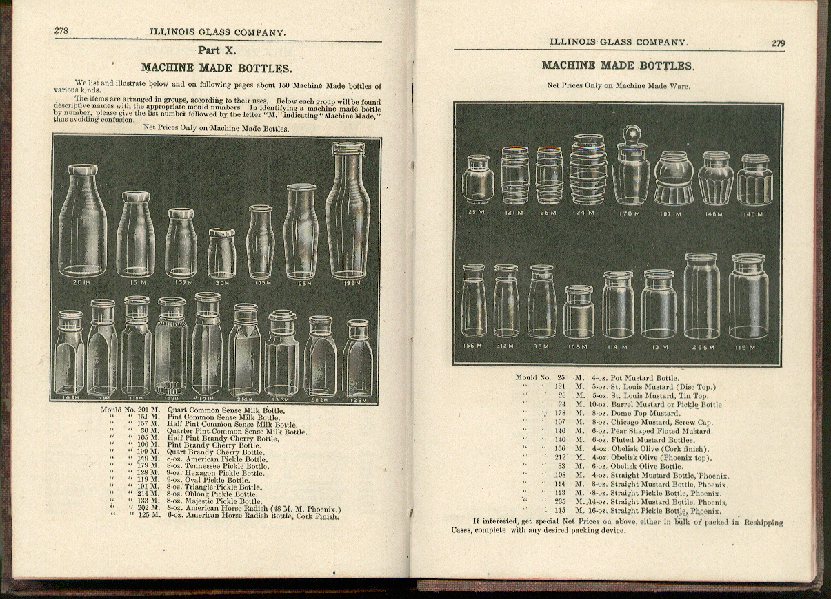 The first decade of the 1900s was a pivotal time in glassmaking history as the first serious assaults on mouth-blown manufacturing methods were just beginning to be made by machines. By 1906, there were some semi-automatic machines beginning to produce wide-mouth jars and bottles in quantity. Pages 278-287 of the 1906 IGCo. catalog lists an assortment of wide mouth "Machine Made Bottles" that the IGCo. was producing; items which were not listed in the previous (1903-1904) catalog. These "Machine Made Bottles" were almost certainly made by semi-automatic press-and-blow machines where the glass had to be hand fed into the machine since the IGCo. was not licensed to use the Owens Automatic Bottle Machines - the first fully automatic bottle machines - until 1911 (Miller & McNichol 2002). Given this fact, it is certain that all of the bottles in this catalog were mouth-blown with the exception of noted wide mouth items listed at the end of the catalog which would exhibit machine-made characteristics (see the Machine-made Bottles dating page for more information) .