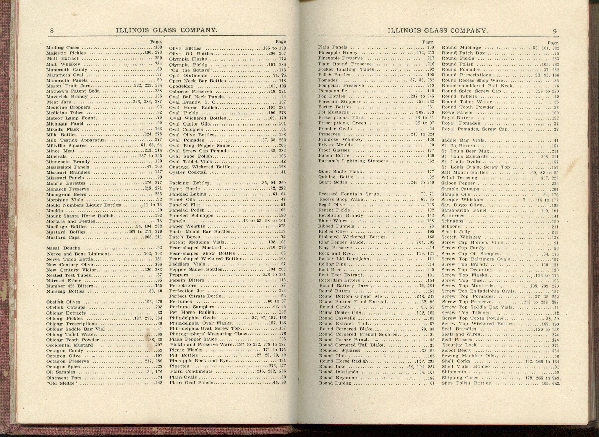 If a user wishes to search for a particular bottle type (or other catalog listing) in the catalogs "General Classified Index," these pages are linked immediately below. Determine the page number of the item you are interested in then find that page link further down this page and click on it. Just be aware that some of the proprietary names that the company (and all bottle making companies) used are not always intuitively clear as to what type of bottle it is referring to: