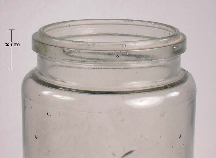 Wide mouth (bore) bottles and jars with machine-made characteristics can date from as early as the mid-1890s, but primarily date after about 1900. These bottles/jars are primarily food bottles and canning/fruit jars. A wide-mouth machine-made canning jar is pictured above left.