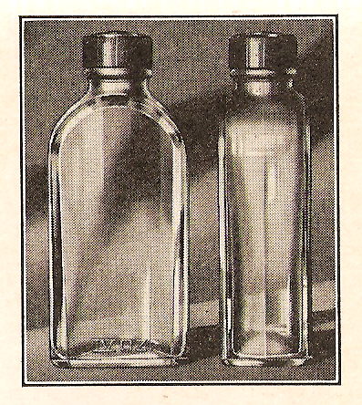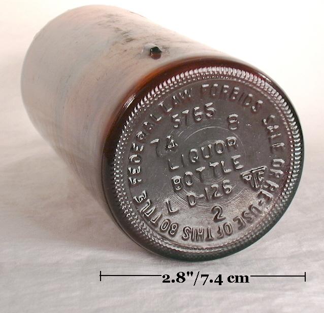 One notable exception to the above is that many earlier machine-made liquor/spirits and milk bottles had volume notations embossed in the glass (e.g., "QUART," "FULL QUART," "ONE PINT," etc.) or on the label as early as 1900-1905, though the large majority of machine-made bottles with capacity information date from the 1913 law or after. Click "FULL PINT" embossed flask to see an example of an relatively early (1919) machine-made liquor flask that is embossed with FULL PINT on the shoulder. Volume notation on liquor bottles was apparently a marketing issue and seems to be related to the rise of mail-order liquor which is briefly discussed under the Tall, slender bodied, straight neck spirits cylinders (late 19th & 20th century) section on the Liquor & Spirits Bottles page. The use of volume notations on earlier milk bottles was likely associated with the demands for more cleanliness, reliability, and predictability of the product once home delivery began to be popular in the early 1900s (though reportedly began in 1878). See the milk bottle section of the typology pages for more information.