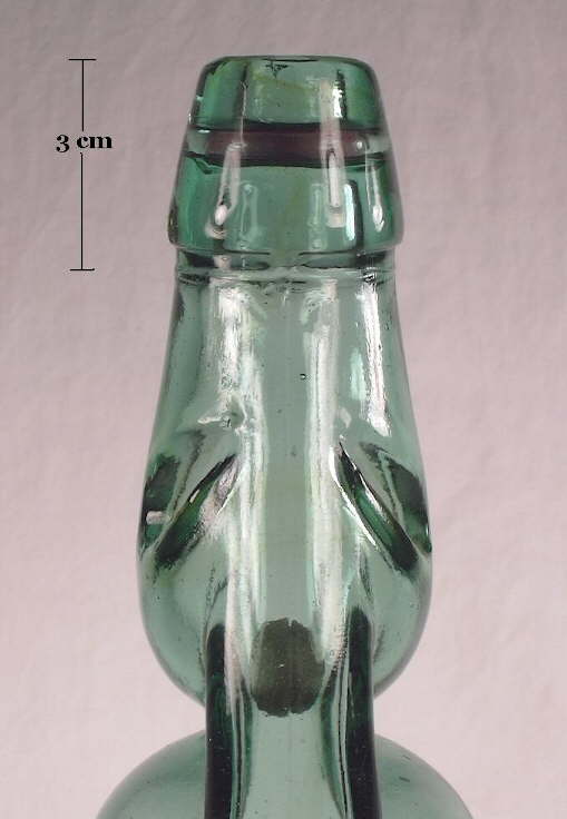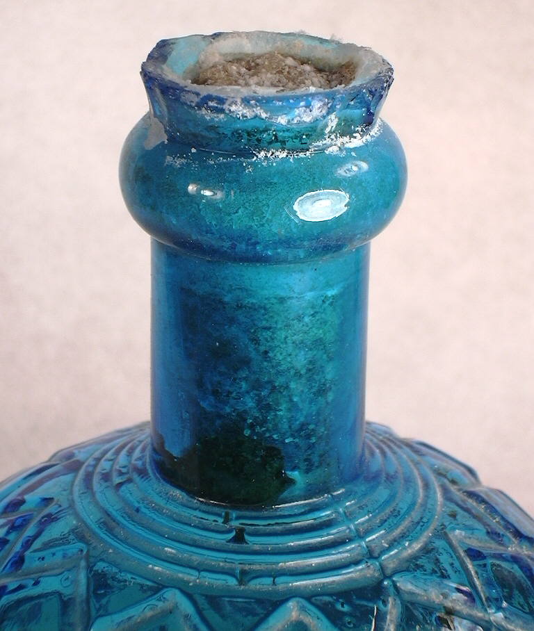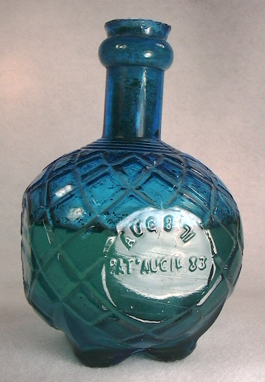 The 1871 patent (#117,891) was issued to Samuel B. Johnson of Philadelphia, PA. for the concept of a breakable ("...constructed of metal, glass, or other material suitable for the purpose intended..."), fire extinguishing "grenade" that could be hurled into a fire to put it out. Johnson did note that "It is preferable that the vessel be in the form of a grenade or bomb, and constructed of glass, that it can be easily thrown or discharged, and break when it strikes the spot against or towards which it is intended." The 1883 patent (#282,981) was issued to John J. Harden of Chicago, IL. for a "Hand-grenade for Fire-extinguishers." Apparently, Harden acquired rights to Johnson's 1871 patent for a throwable glass grenade, but refined his product further with the 1883 patent which was basically for a glass bottle with a specific finish and seal. Click view of the neck and finish to see a close-up of the grenade's neck, finish and closure which still retains the cement seal - which fills the length of the neck also - and most of the original contents (some evaporation through the seal). The patent was for - "A hand-grenade for fire-extinguishing purposes, consisting of a receptacle formed of glass or other frangible, material and having an orifice provided with a stopple fitted therein, the stopple being provided with an interior recess opening into the interior of said grenade, containing the requisite acid and alkali, forming a charge of carbonic-acid, or other fire extinguishing gas, said orifice being also provided with an enlargement above said stopple, and ending with an inwardly-inclined flange...". This translates from that patent-speak into a throwable glass bottle ("grenade" which was not specifically patentable at that juncture in time) with the unique finish shape and cement seal ("stopple") as shown (which was patentable).