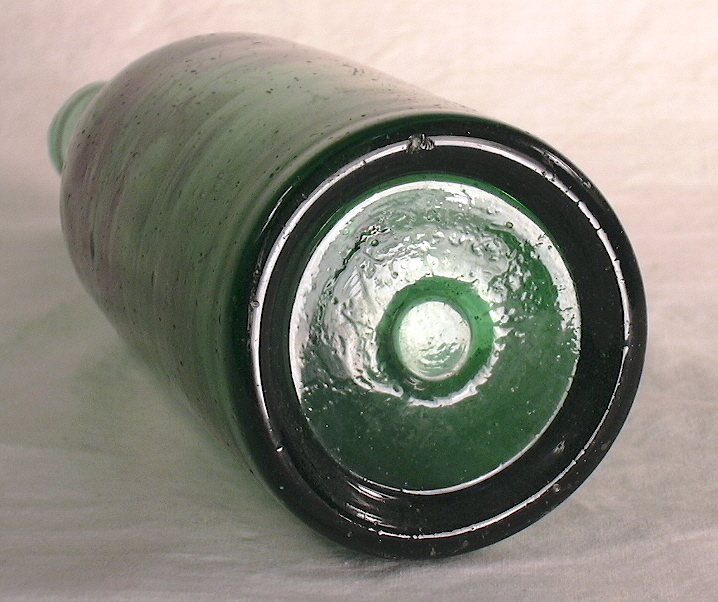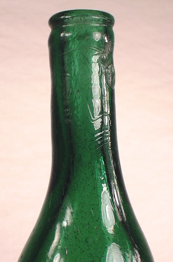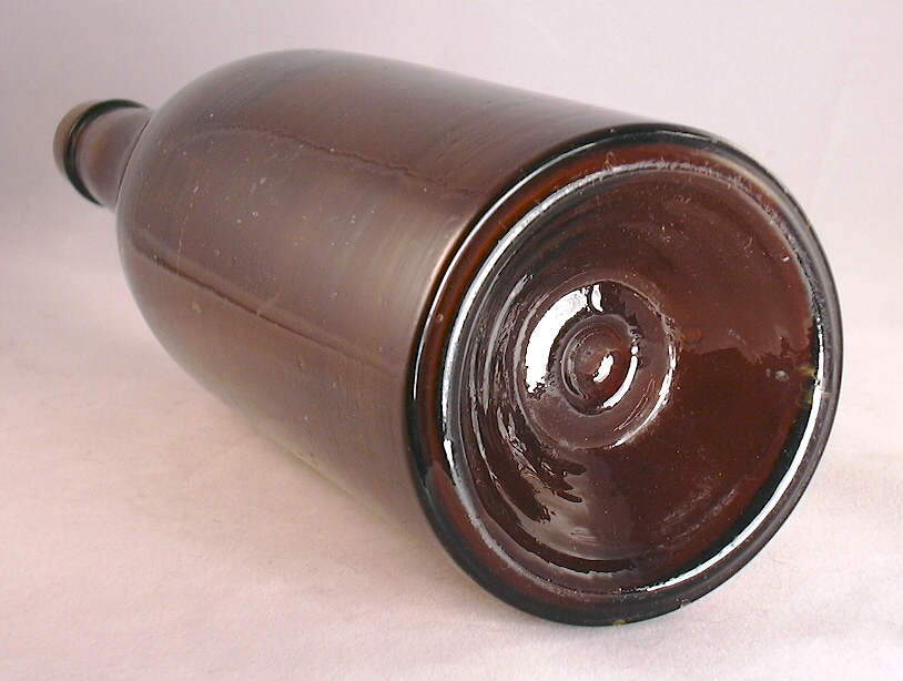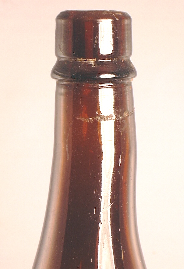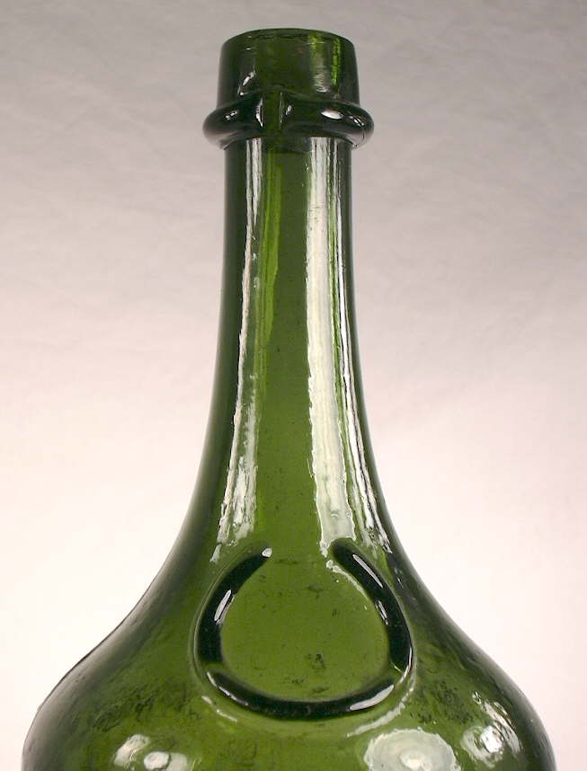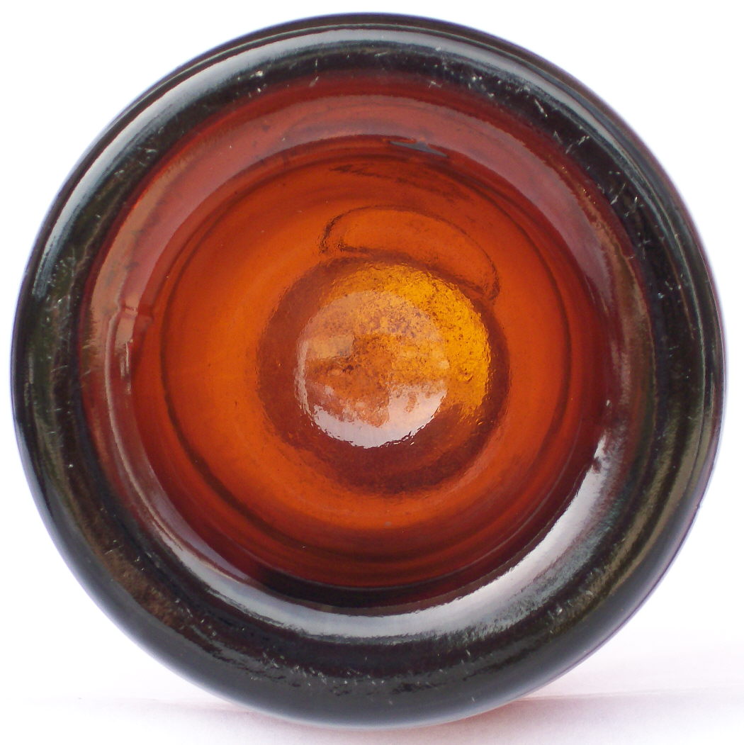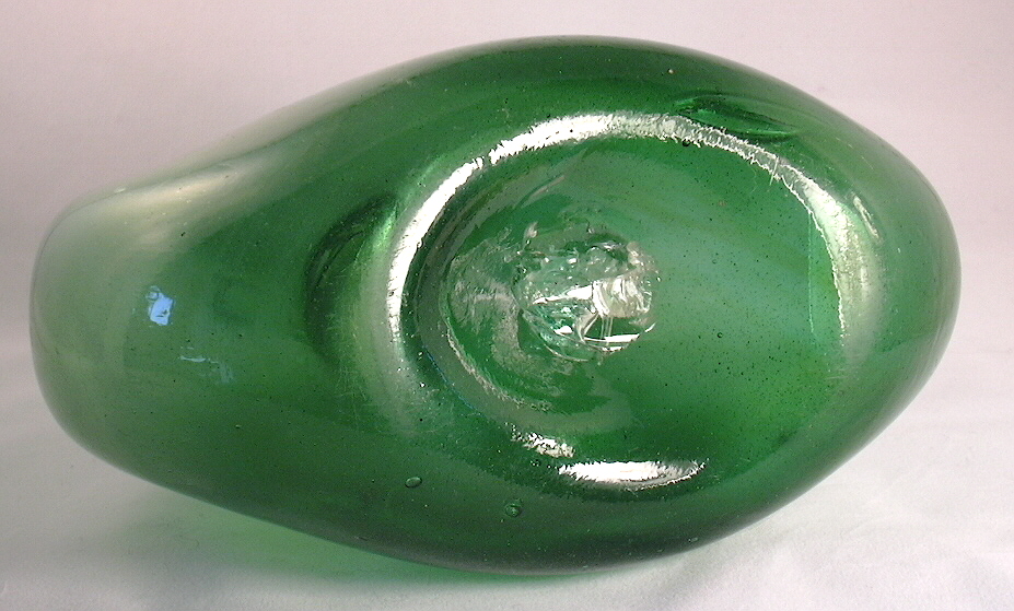 Dating summary/notes: The dating of these type bottles based on manufacturing related diagnostic features roughly follow the guidelines presented throughout this website and summarized on the Bottle Dating page; see that page for more information. There are, however, several manufacturing related diagnostic features or dating trend trends that have been noted by the author that don't follow those found on smaller utilitarian bottles. The first is that these large bottles tended to be made by mouth-blown methods later than when a majority of most other bottle types were being made on machines. For example, the 1920 Illinois Glass Company catalog linked above notes that their new carboy factory in Alton, IL., completed in January 1919, had "...installed in it an Automatic Machine, the capacity of which is devoted exclusively to the manufacture of Carboys, Water Bottles and large Containers, ranging from two to twelve gallons." This implies that prior to that time the production of carboys and "large Containers" was likely still done by hand methods, aka "mouth-blown." In addition, Soetens (2016) noted that the first fully automatic bottle machine in Europe was first used sometime shortly after 1923. That author also mentioned that demijohns were still being produced by hand - i.e., mouth-blown - at least as late as 1950 in Germany. And finally, a recently noted YouTube video indicated to be filmed at Gayner Glass Co. (Salem, NJ) in the 1940s shows workmen still making demijohns by largely hand methods that late into the 20th century. (That video is available at the following link: https://www.youtube.com/watch?v=8CzMik9oelU&ab_channel=ricgrass ) Related to the above is the observations is that older bottle making methods were used much later on very large bottles as demijohns were were still being held for finishing with pontil rods after the general end date of around 1870 for smaller, utilitarian bottles (Jones & Sullivan 1989:45; empirical observations). The other bottle type specific dating irregularity noted is that mouth-blown demijohns tended to have applied finishes later than most other bottle types as well as being produced in molds with a post-base configuration mold later. Specifically, applied finishes are thought to have been used on mouth-blown demijohns - like the two amber examples to the above right - into the late 1890s and possibly early 1900s, which was well after most bottle types were having finishes formed by tooling. See the main Bottle Finishes & Closures page for more information. In a related fashion, post-base molds were used into the early 1900s with those types of commonly encountered demijohns, again well beyond the period that most other bottles (excluding many mouth-blown fruit jars and beer bottles) were being largely made in cup-base molds. See the post-base (aka "post-bottom") mold section of the Bottle Bases page for more information.