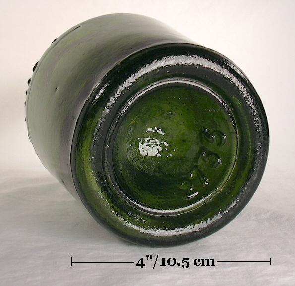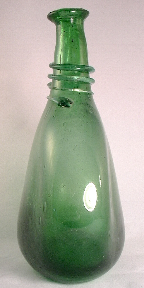 The large oval/bladder shaped demijohn pictured at the top of this section is a mid-19th century, mouth-blown, most likely European made example. It holds at least 5-6 gallons, was blown in a 3-piece mold, has a large applied "oil" type finish, and likely is pontil scarred in some fashion. A demijohn of this size certainly spent its useful life covered in wicker to have survived breakage, though the wicker was removed (or rotted off) at some latter point in time and then stored away for decades. Demijohns of various shapes and sizes are commonly encountered today as they were usually reused for many years and not disposed of unless broken, often being stored away and forgotten. The wicker being dried vegetation most often fell apart with time though examples with wicker (images above) are not uncommon if the demijohn was stored in a dry place like an attic or cellar.