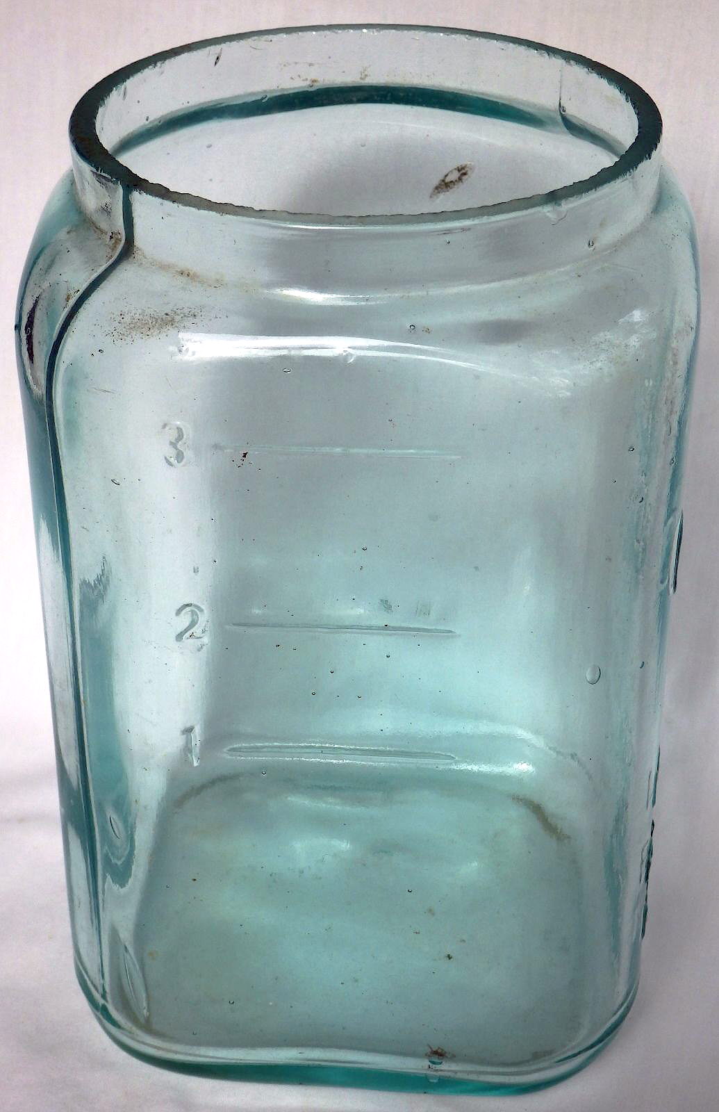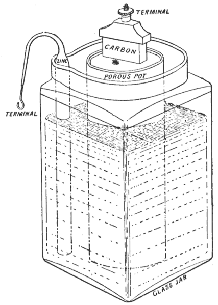 The fourth jar is entitled "Round Battery Jars - Flint. Turn Mold" which indicates these were made in a turn (or paste) mold and in only colorless glass. These were available in over a dozen sizes from a very small 4" x 4" (pint or so) to a robust "9 x 15" which would have been at least a couple quarts in capacity. Of course, most of the battery "contents" would have been the solid parts noted earlier surrounded by a electrolyte conducting solution bath. The inertness of glass to that solution is why these batteries were contained in glass even though that made them fragile. Offsetting the fragility of glass was that they were blown with at least moderately heavy glass thickness (empirical observations). This illustration indicates that three of the jars had perfectly round rims with one (lower left corner) having a "pour spout" and the name "Le Clanche Battery Jar"; more on that below. The square, aqua battery jar shown above is a proprietary battery jar which is embossed on the front with TRADE / GONDA / MARK / THE / LECLANCHE / BATTERY CO. / NEW YORK. On one side it has horizontal fill lines with the numbers "1 2 3" beside; click side view showing fill lines and numbers to see such. On the opposite side is an "M" embossed towards the base with the base having the number "2". (No images of the other side or base and no meaning known for the "M" or the "2".) It is 6 3/4" tall, 4" wide body sides, a wide mouth with a hand ground rim and no "pour spout and was mouth-blown in a cup-bottom mold. Not sure what the GONDA refers to though it was likely just a model/product name for that particular battery? George L. LeClanche (Engineer, Paris, The Empire of France) was issued a patent in 1866 for an "Improvement In Galvanic Batteries" (he was also issued several closely related patents in the 1870s). To view the original patent click US Patent 55,441. Batteries had been invented decades earlier (Wikipedia), so this patent was largely for the specific contents and their orientation within the jar - metal and carbon parts and an electrolyte fluid. The patent had nothing to do with the jar itself (not patentable by this time) though he specifies the use of "...a bottle or jar having a large mouth." The patent also notes that "It is well understood that the two wires must be allowed to pass through the mouth of the bottle" - also implying a non-patentable feature? A 1919 illustration of a battery jar similar to the one above (and to the left) is found at the following link: LeClanche Cell. This illustration of the "LeClanche Cell" clearly shows a "pouring spout" on the rim of the jar - the location where the wires emerged from the jar - though this feature was not specifically mentioned in the any of the patents found. The illustration to the left is the fifth battery jar listing in the above earlier noted 1906 Illinois Glass Company catalog.