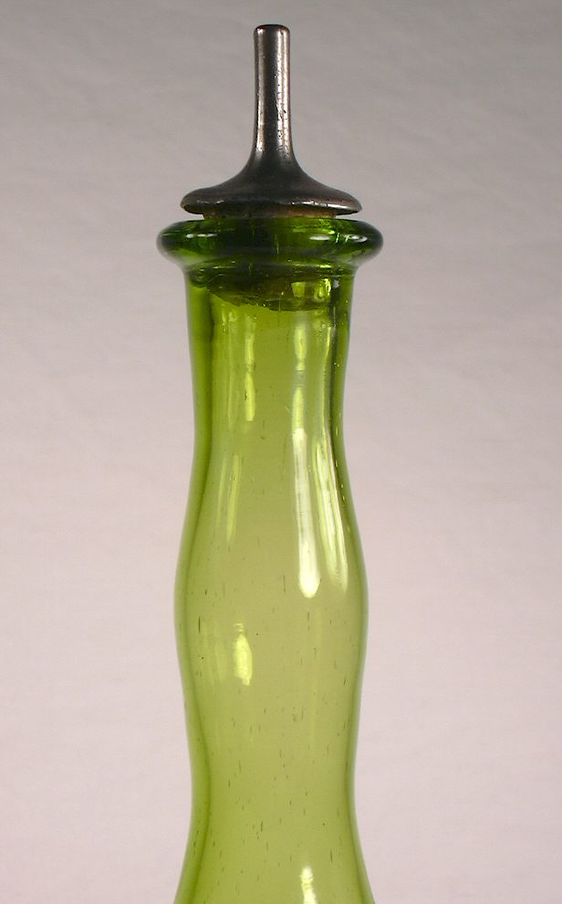 (*Authors note: As noted at the 1906 Pure Food and Drug laws link, until the 1912 passage of the Sherley Amendment to the 1906 Act, enforcement of the Pure Food and Drugs Act was limited at best. Even then, enforcement was a process that took years to make a difference.) The primary heyday of this class of bottles was from between the 1870s until the late 1910s. By the 1920s, when these bottles ceased to be produced in quantity, they had moved from a working container into the early realm of collectability due to their beauty (Munsey 1970; Holiner 1986). Barber bottles were certainly produced, sold and used well into the 1910s. For example, Theo Koch & Sons - a New York barber supply company - in their Barbers Supplies catalog of 1915 still offered a wide array of imported "Stand Bottles" made in "Bohemia" which at that time included all/parts of Czechoslovakia, Poland, Austria and Hungary. The bottles were also made in other European countries such as England, Germany, Italy, Belgium, and France. And many were made in the United States. Unfortunately, few barber bottles were marked with the place of origin so attribution to any country, much less glass company, is usually not possible. American companies such as The Boston & Sandwich Glass Company, New England Glass Works, Fostoria Glass Company, Fenton Glass Works, Whitall Tatum & Co. and others made these bottles also (Holiner 1986). The bottle pictured to the right above is an opalized (white details) and frosted (between the white) "daisy and fern" design dating from the 1890s or early 1900s, and possibly American made (Holiner 1986:78). It has a smooth base (not pontil scarred) but otherwise exhibits a hand-made, art glass quality manufactured look. It also has a sprinkler top still in place. The following barber bottles give some idea as to the variety possible in both shape and colors. These bottles date from the 1885 to 1920 era and are provided compliments of Glass Works Auctions. There were likely thousands of different variations of these bottles made during the era noted above.