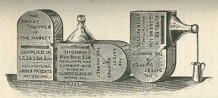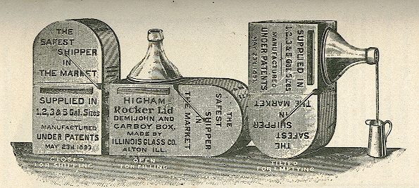 A few of the references consulted noted either a functional or design differentiation between these two large bottle names. For example, Odell (2008) mentioned that functionally "Demijohns were for potable and non-corrosive liquids" with "carboy contents...strong chemicals - mostly acids." Munsey (1970) noted stylistically that "Demijohns were usually manufactured in a bulbous or bladder shape and have rather long necks; carboys, on the other hand, were generally cylindrical in shape and had short necks." For example the large olive green bottle to the left would be a "demijohn" with the 5 gallon bottle illustrated to the right below being a "carboy." The latter "carboy" shape has been commonly used for drinking water - a decidedly potable and non-acid liquid - from at least the early 20th century to the present, though typically plastic bottles today. (In fact, the 5 gallon "carboy" illustrated below right - and from a 1920 bottle makers catalog - is labeled as a "water bottle.") To add to the confusion the 1906 Illinois Glass Company catalog scanned and located on this website shows a listing for a cylindrical, short neck "demi-john" (page 110) and a bulbous/bladder shaped "carboy" (page 112) - the reverse of Munsey's styles differentiation. For simplicity sake, the term demijohn is largely used here for all large capacity glass bottles.