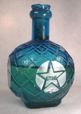 The turquoise blue fire grenade pictured to the left is a Hardin's fire grenade variation, most likely a bit later in manufacture (early 1900s) though mouth-blown manufactured in the same fashion as the example above. It is about the same size and dimensions as the example above, but differs in the body design which is numerous vertical ribs broken in the middle by a protruding body encircling band. The band is embossed with HARDEN'S HAND GRENADE FIRE EXTINGUISHER and on one shoulder side has the word STAR inside a star in a circle, the same as found on one side of the earlier discussed bottle. There were many other types of fire grenades made in various shapes from the 1870s until 1920s or later; see Munsey (1970:196-197) to view a more types illustrated there. This author knows of no book dedicated to the subject although there is some information and additional images of these type bottles in Freeman (1964:350-351) and Ferraro (1966:63-67). A few additional 1870s to 1910s "grenades" are listed as follows: