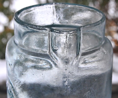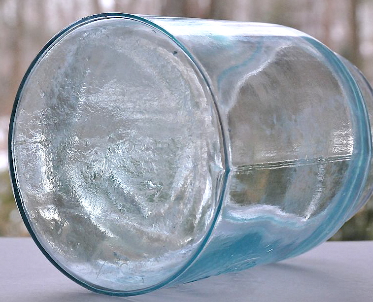 The cylindrical battery jar to the right is embossed in a circular plate with WESTERN ELECTRIC CO. / NEW YORK. The base of this jar indicates manufacture in a cup-bottom mold - typical of these jars from the late 19th to early 20th century. Click base view to see such. Like virtually all mouth-blown battery jars this example has a ground rim; this is shown in the close-up view of the jar to the right (click to enlarge). Western Electric, which was founded in 1869, is still in business today although as part of a larger company. It is not known for sure when glass battery jars were phased out although they are NOT listed in the 1920 or 1926 Illinois Glass Company catalogs so it appears that they were replaced by less fragile materials by about that time? This author has never seen a machine-made glass battery jar that is similar to the ones shown here, though such likely exist. For more information on the history of batteries, including battery jars, George LeClanche and more, search Wikipedia for the page entitled - "History of the Battery" (with no quote marks).
