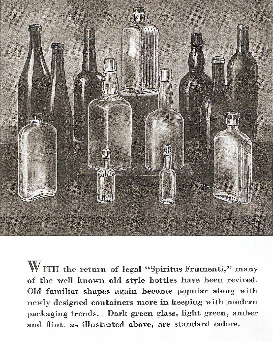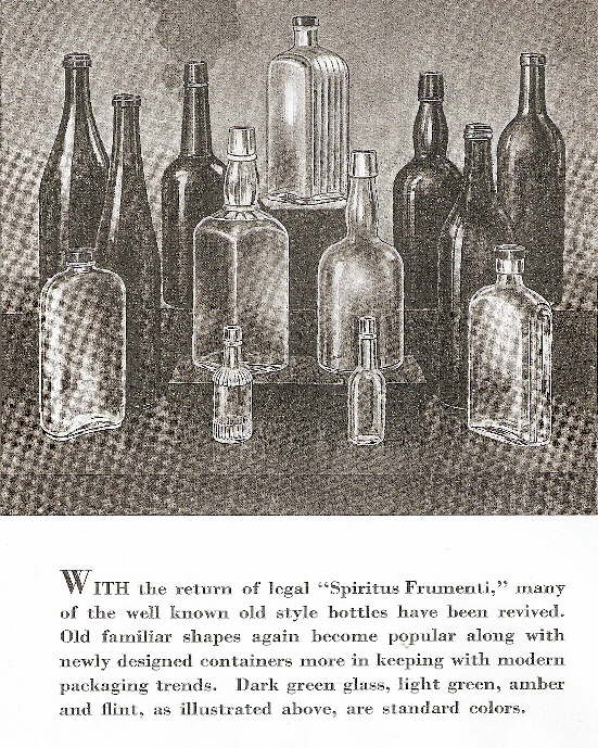 With the return of legal "Spiritus Frumenti," many of the well known old styles bottles have been revived. Old familiar shapes again become popular along with newly designed containers more in keeping with modern packaging trends. Dark green glass, light green, amber and flint, as illustrated above, are standard colors.
