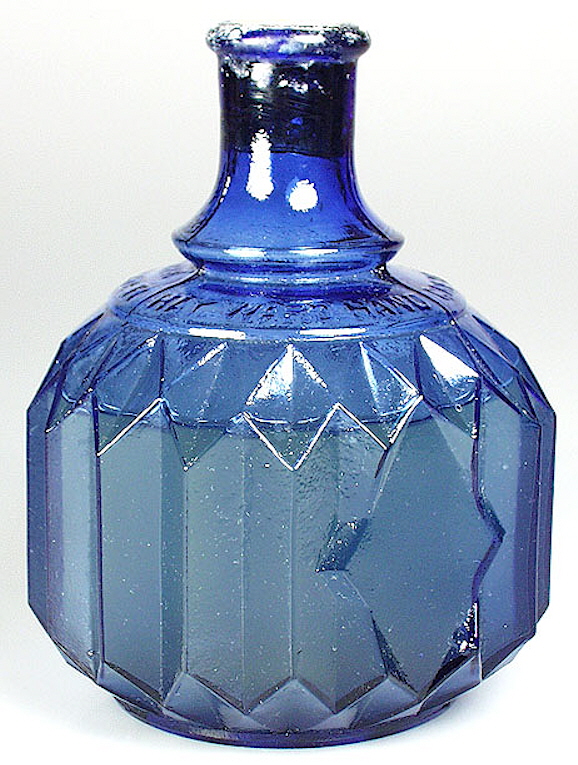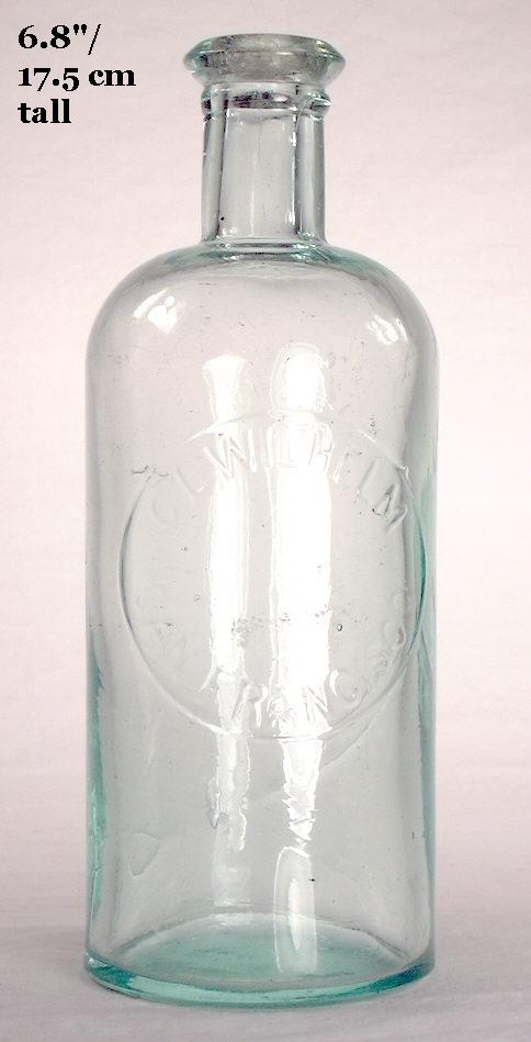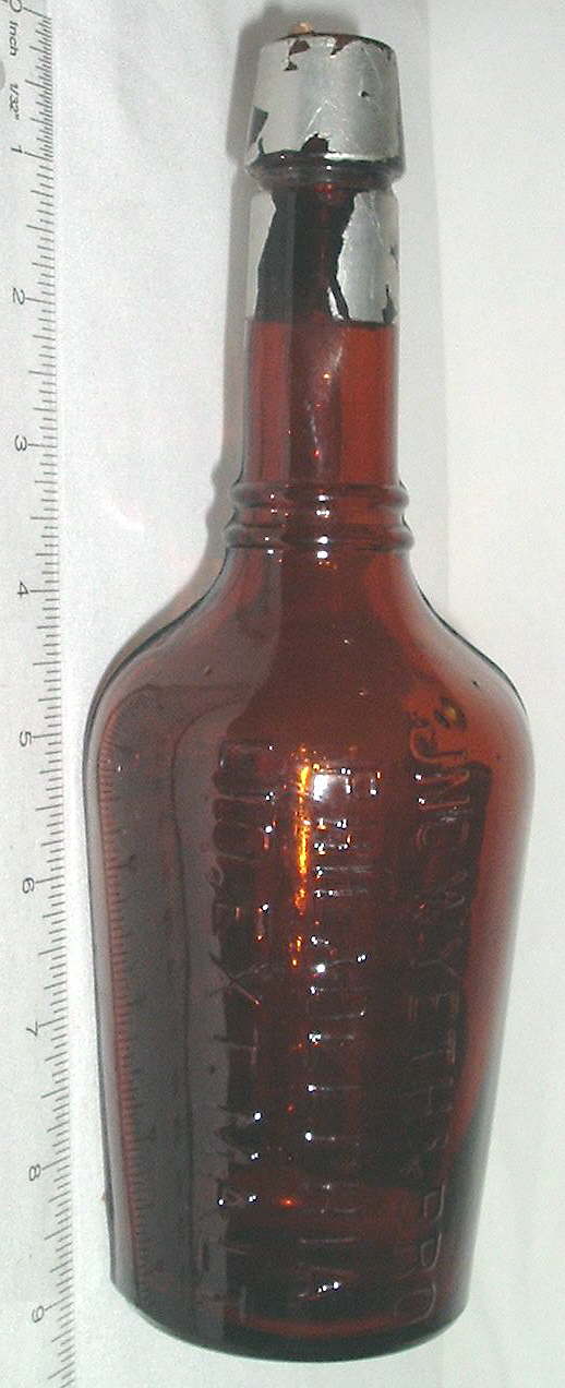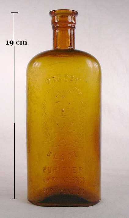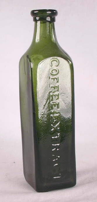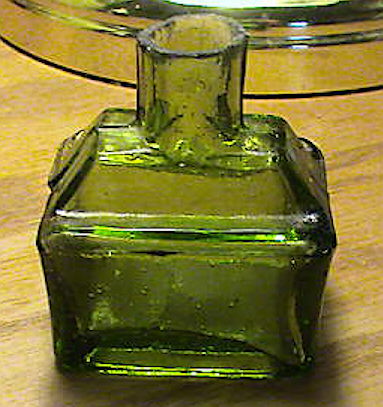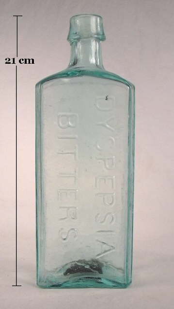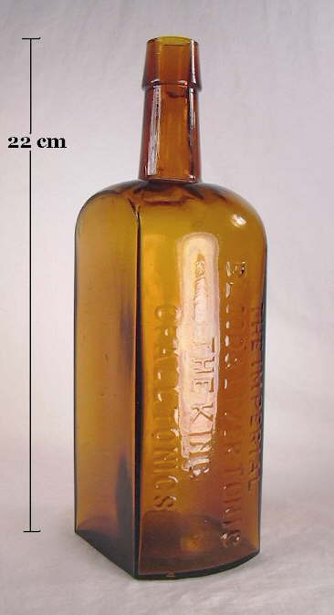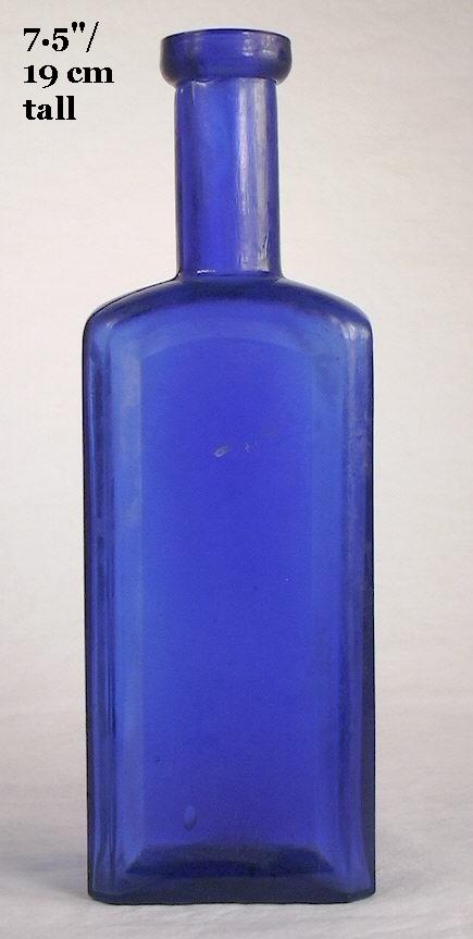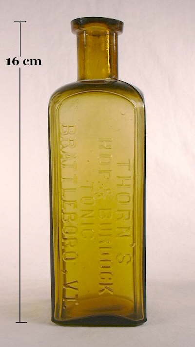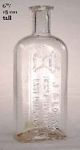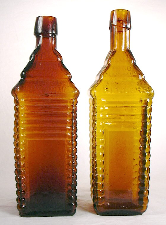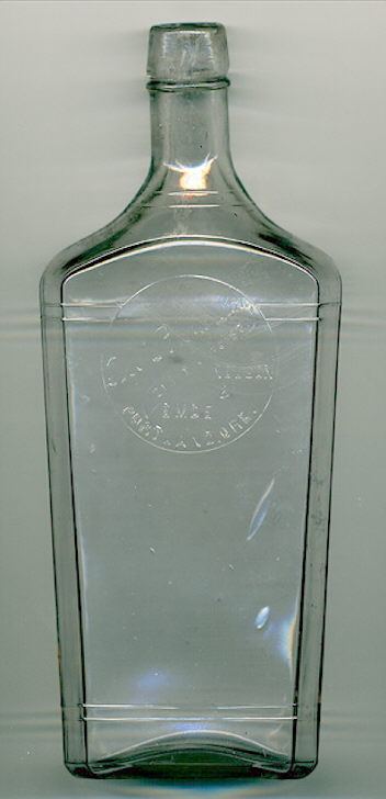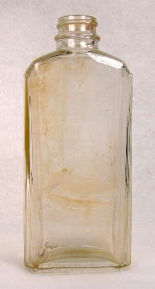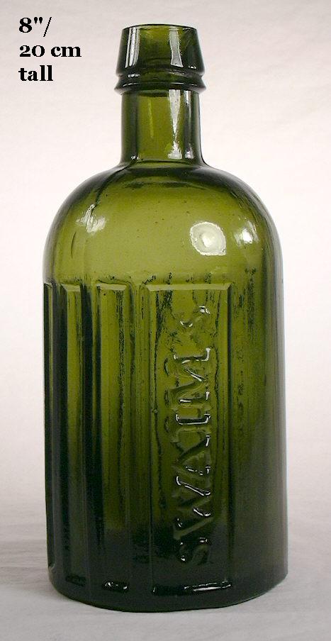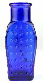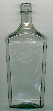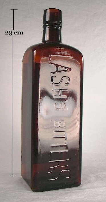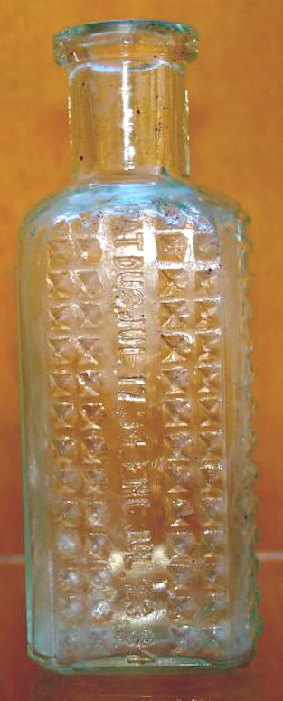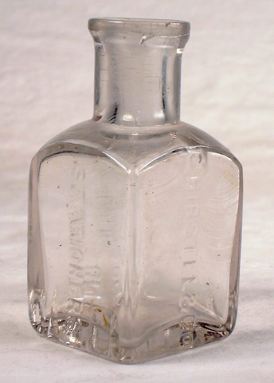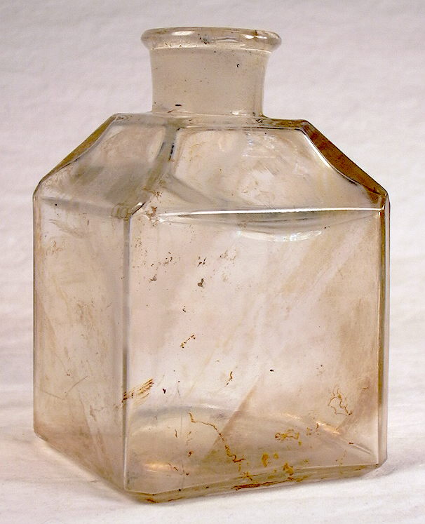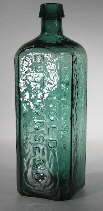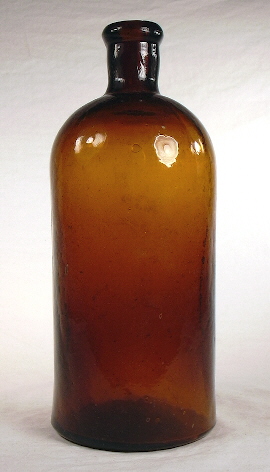 However, consumers of the time - just like today - looked for certain products in certain shaped packages. Because of this most users of bottles used some accepted or standard shape for a given product. A square, short necked bottle like that pictured below was very commonly used for medicinal products and in particular "bitters" which was a very popular type of usually high alcohol medicinal product during the 19th and early 20th centuries. This general shape was also used for "schnapps" - another high alcohol nominally medicinal product. In fact, early bottle makers called this shape either a "bitters" or a "schnapps" (Illinois Glass Co. 1903-04, Alther 1909). If the bottle is embossed (or labeled) with the product name or type, then one knows for sure what it originally contained. If the bottle is not embossed or labeled, then the shape can still be very indicative of what the contents most likely were. 2. Any given bottle could have been recycled and reused many times for totally unrelated products.