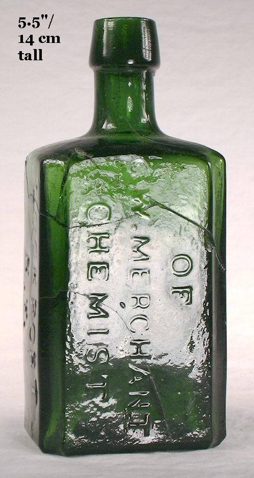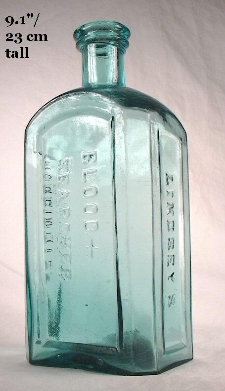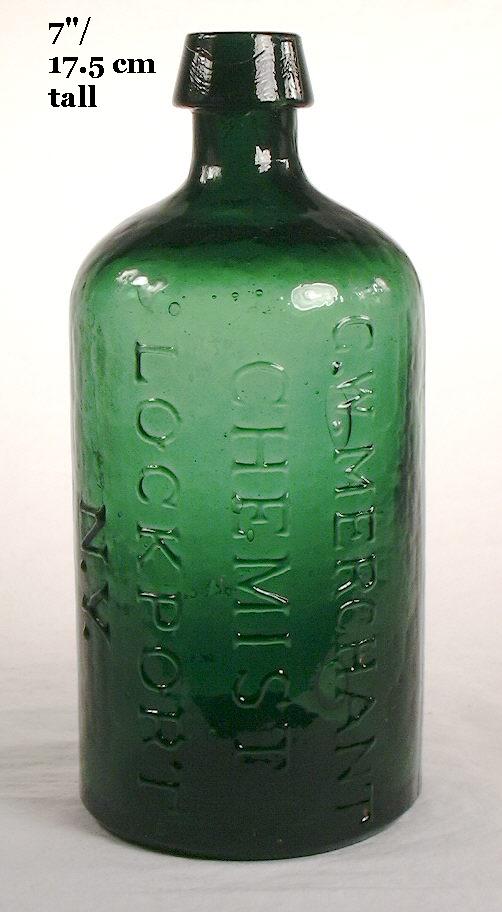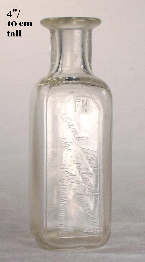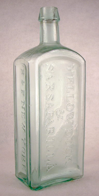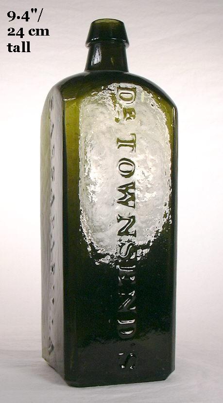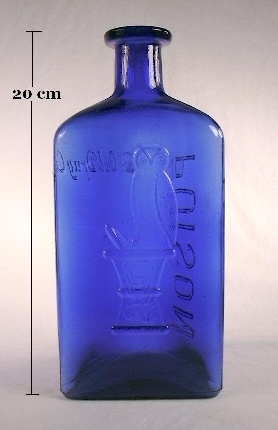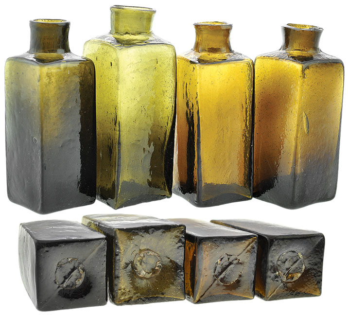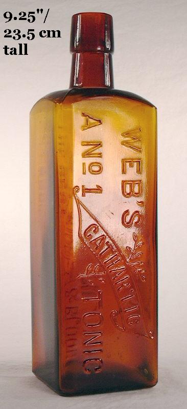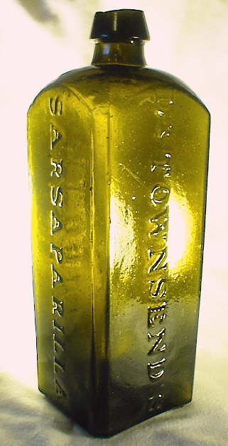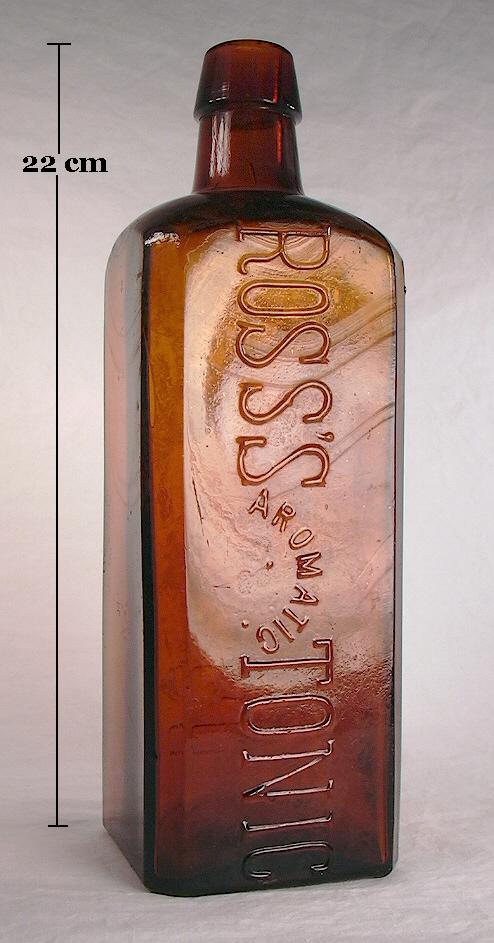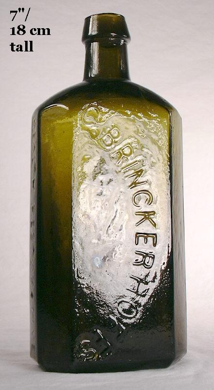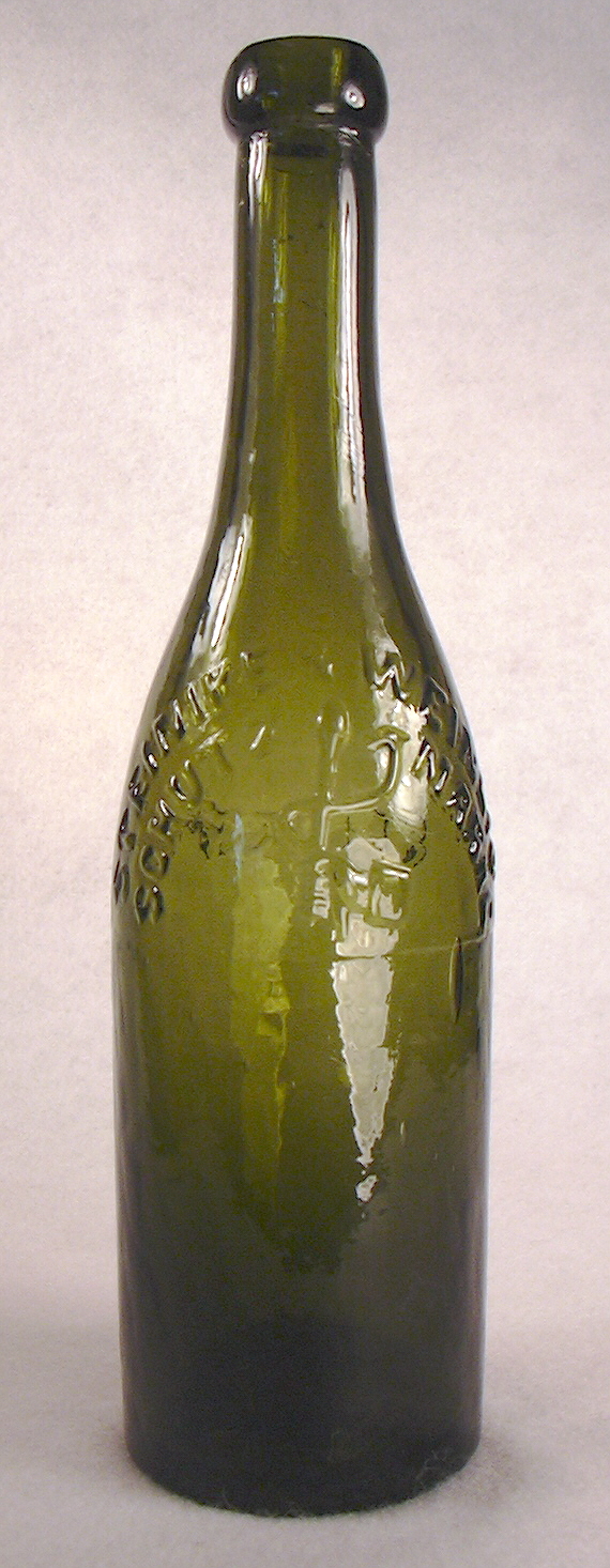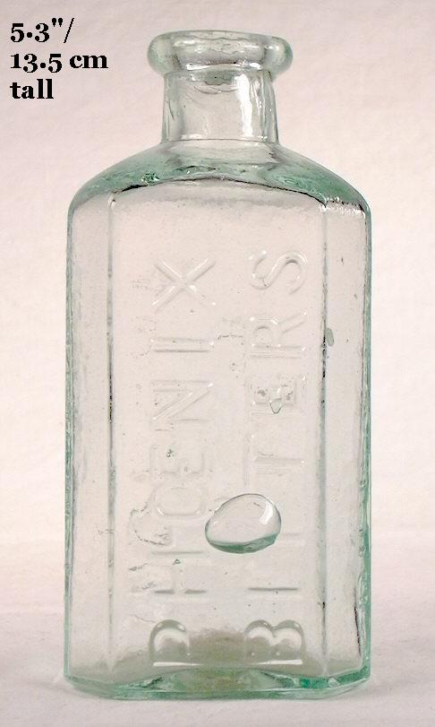 However, consumers of the time - just like today - looked for certain products in certain shaped packages. Because of this most users of bottles used some accepted or standard shape for a given product. A square, short necked bottle like that pictured below was very commonly used for medicinal products and in particular "bitters" which was a very popular type of usually high alcohol medicinal product during the 19th and early 20th centuries. This general shape was also used for "schnapps" - another high alcohol nominally medicinal product. In fact, early bottle makers called this shape either a "bitters" or a "schnapps" (Illinois Glass Co. 1903-04, Alther 1909). If the bottle is embossed (or labeled) with the product name or type, then one knows for sure what it originally contained. If the bottle is not embossed or labeled, then the shape can still be very indicative of what the contents most likely were. 2. Any given bottle could have been recycled and reused many times for totally unrelated products.