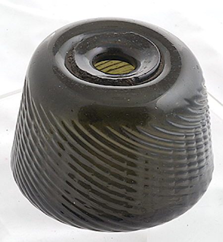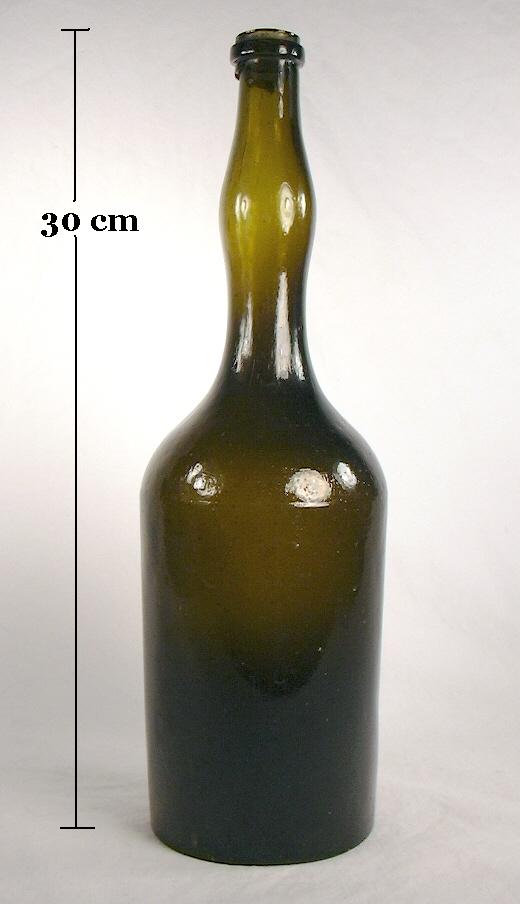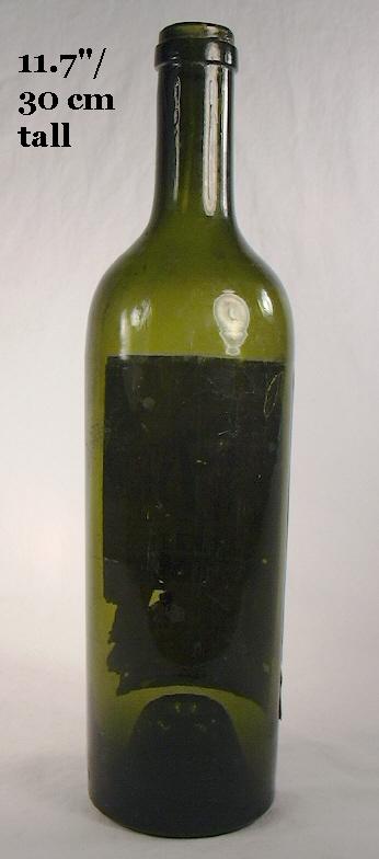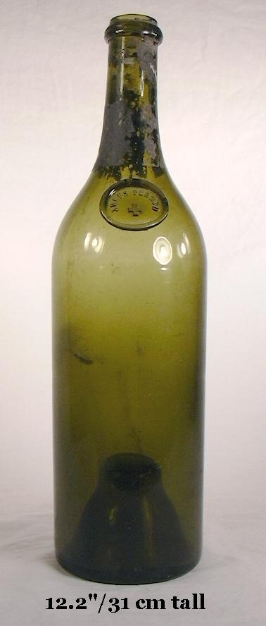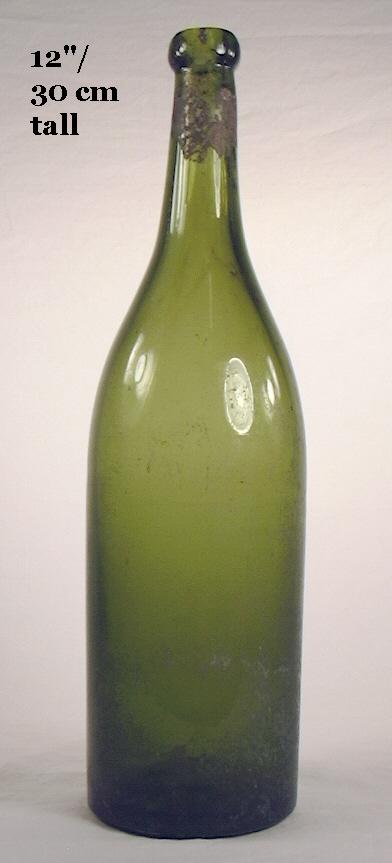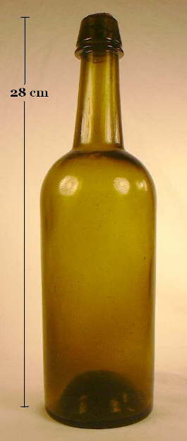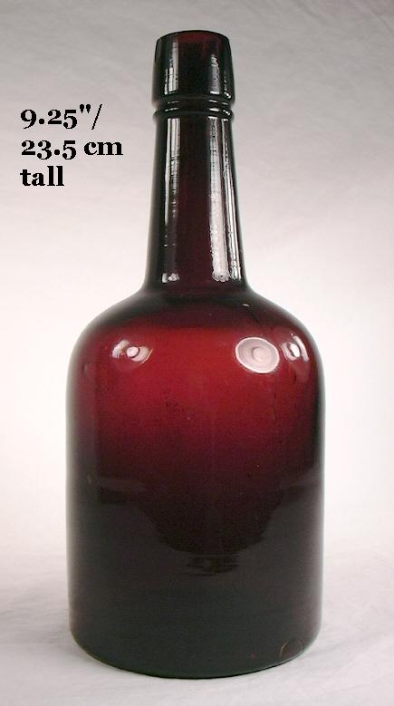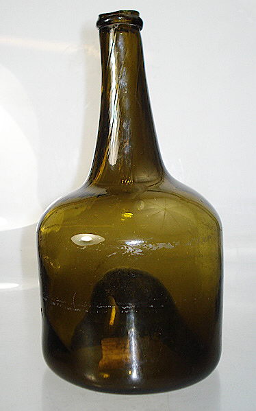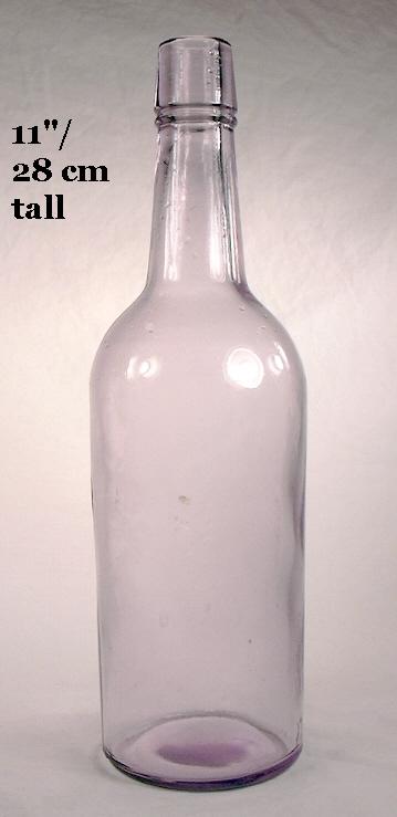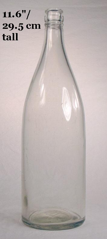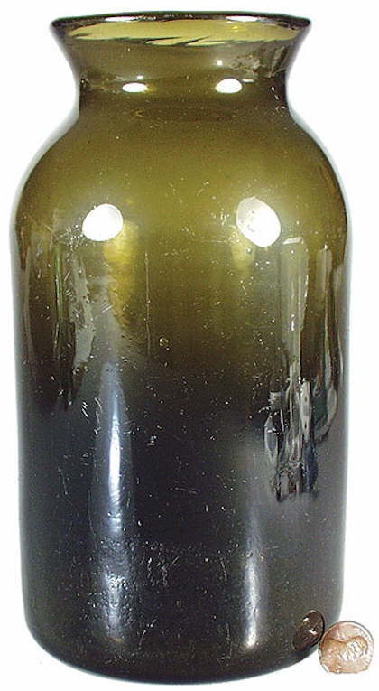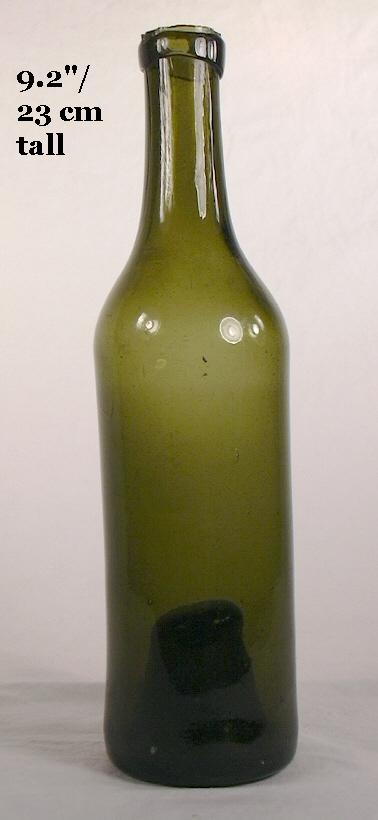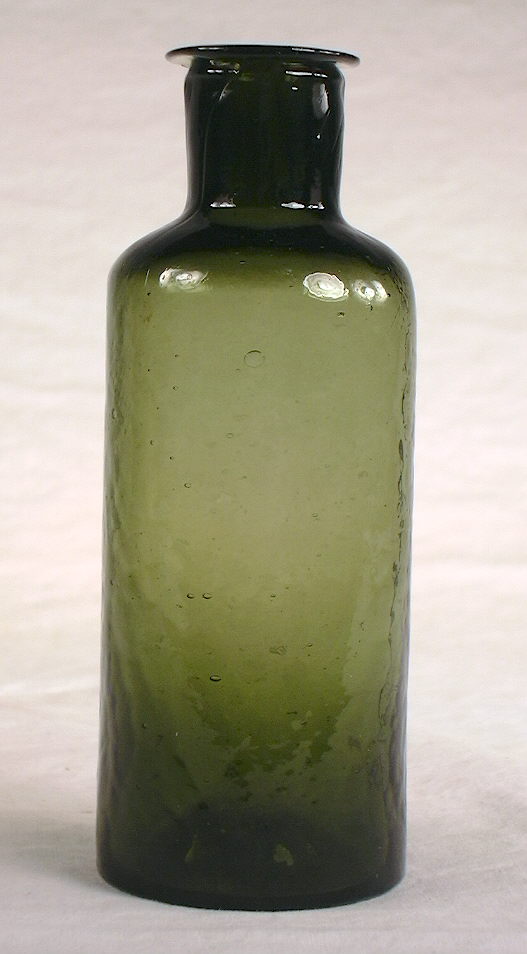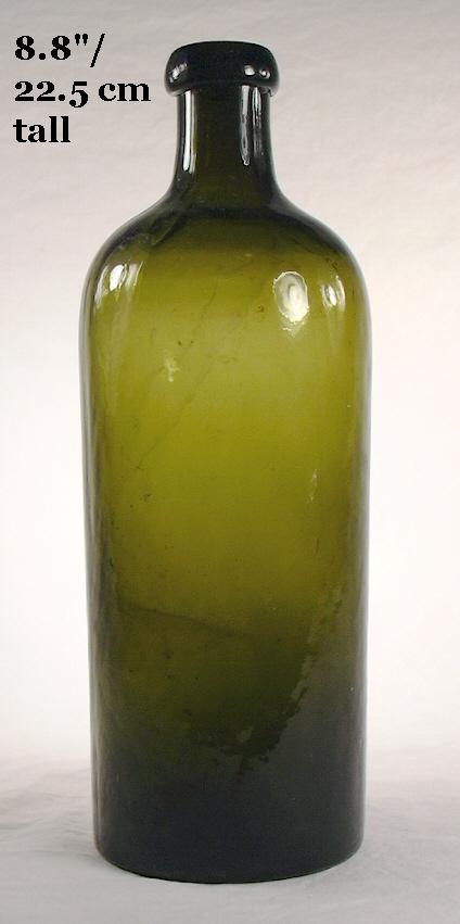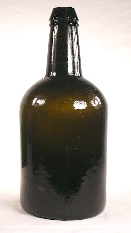 For example, one would expect an unembossed bottle of the same shape as the Teakettle sharing similar manufacturing related diagnostic features (applied finish, no air venting, post-mold base) to likely be a liquor bottle that dates from the 1870's or early 1880's. The unembossed cylinder "fifth" liquor bottle pictured to the right has virtually all the same diagnostic features of the Teakettle except that it was blown in a four-piece instead of a two-piece mold ( a feature which does not affect the estimated dating range - see the mold type discussions on the Bottle Body Characteristics & Mold Seams page). Because it has the same shape and shares the same primary manufacturing characteristics, it is reasonable to conclude that this bottle almost certainly dates from the same era as the Teakettle, i.e., approximately 1875 to 1885 and held some type of spirits.