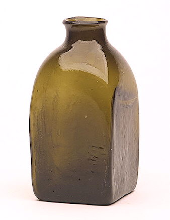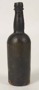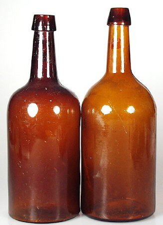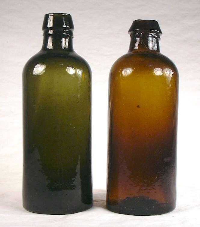 Alcohol was an important ingredient in many other products also, ranging from of course wine, champagne, beer, ale and porter (all covered in the next two sections) to most patent and proprietary medicines, bitters, and tonics to even preserved ("brandied") fruits. However, this section of the "Bottle Typing/Diagnostic Shapes" complex of pages just covers liquor bottles where the contained product was high in alcohol (20%+) and the intended use was not primarily medicinal - or at least the acknowledged medicinal utility was of secondary importance. Liquor/spirits bottles were, as noted, bottled in a very wide array of different types or styles of bottles. Today some of the basic general shapes that originated in the 19th century are still in use, e.g., the "Dandy" flask and cylinder "fifth", though of course produced with modern machines and (usually) utilizing more modern closures. Many or most other liquor bottle styles are not used today. Because of the immense diversity of shapes used over time, the Liquor/Spirits Bottle typing webpage (linked below) is quite large. As with all historic bottle types and shapes, there is a wide variation of subtle differences to be found within the various diagnostic shape classes which are covered in this section; thus, don't dwell to closely on minor nuances. From this point a user needs to either scan the thumbnail images below to find the liquor bottle type they are interested in or click Bottle Typing/Diagnostic Shapes: Liquor/Spirits Bottles to move to that page which specifically covers the various types of liquor bottles commonly produced and used during the era covered by this website - the 19th century through mid 20th century. This page covers the following general, and somewhat arbitrary, shapes of liquor bottles which may be clicked on to move directly to that section of the page. (These are further divided on the Liquor/Spirits Bottles page.):