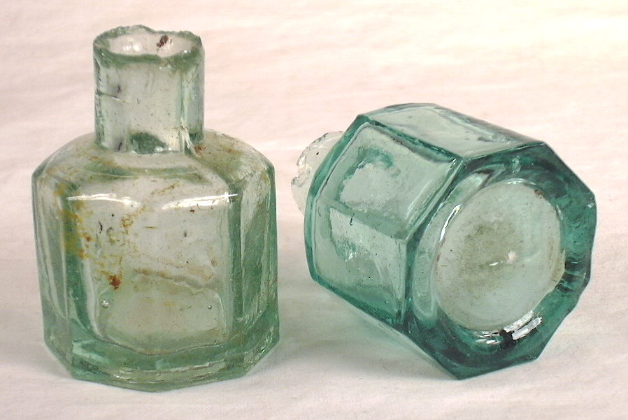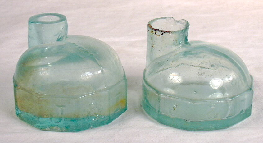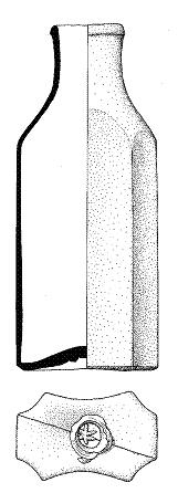 Note on Base Profiles/Cross-section shapes: One bottle shape related feature which is not broadly addressed on this website is the base profile or shape. This is typically the shape of the bottle base when viewed straight on. It is also usually the cross-section shape of the bottle body, though there are exceptions to the latter, e.g., "mug-based" soda bottles have an octagonal base but a round body cross-section shape. (Click Mt. Hood Soda Water to see an example of a mug-based Hutchinson soda bottle from Portland, OR.) Base profiles and/or the body cross-section shape are a distinct feature of a bottle that has utility when describing a bottle and is addressed here on a bottle specific basis. Base profiles are not addressed broadly because there is little specific dating or typing information to be gleaned from simply knowing the base profile, though the profile can assist at times with the typing of a bottle on a case-by-case basis.